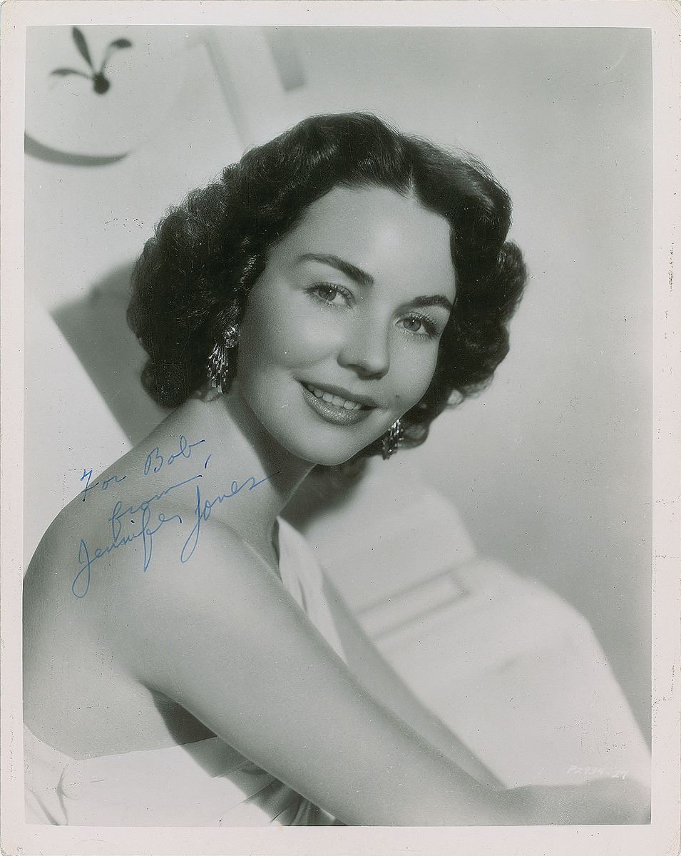 Lovely vintage glossy 8 x 10 photo of Jones, signed and inscribed in fountain pen, "For Bob from, Jennifer Jones.” In fine condition.