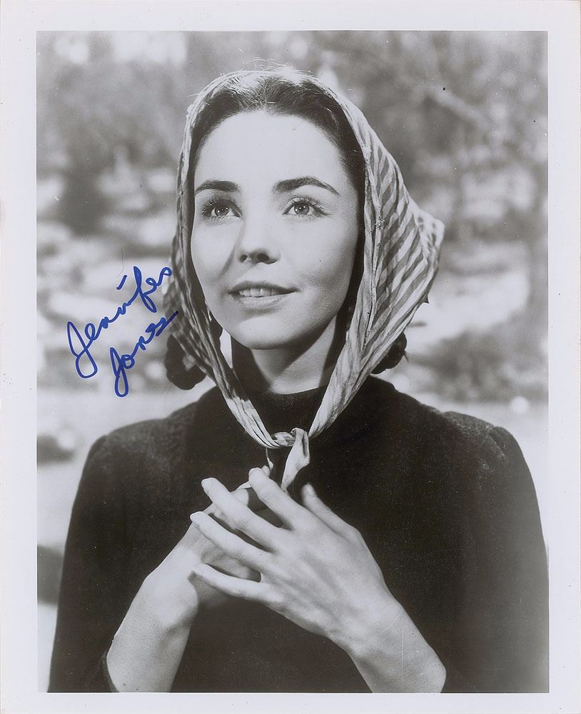 Glossy 8 x 10 photo of Jennifer Jones in her Oscar-winning role as Bernadette Soubirous in the 1943 film The Song of Bernadette, signed in blue felt tip. In fine condition. Originally obtained by in-person specialist Mike Wehrmann.