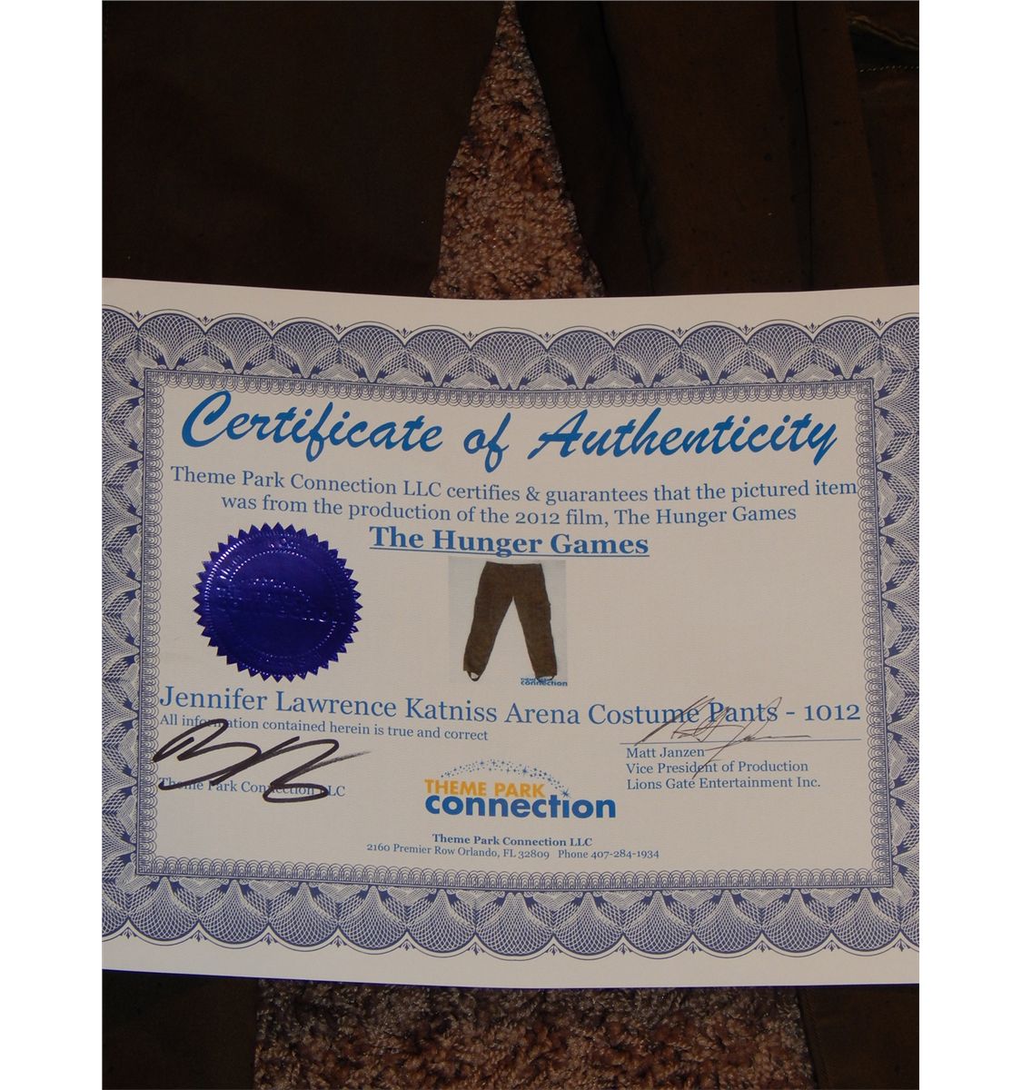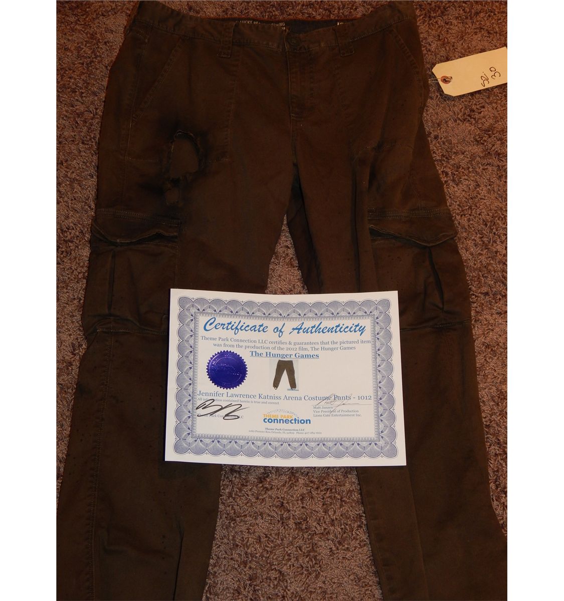 Jennifer Lawrence on screen worn and distressed arena pants from HUNGER GAMES the first film with illustrated letter of authenticity signed by studio who did the film LIONS Gate, Incredible investment grade piece