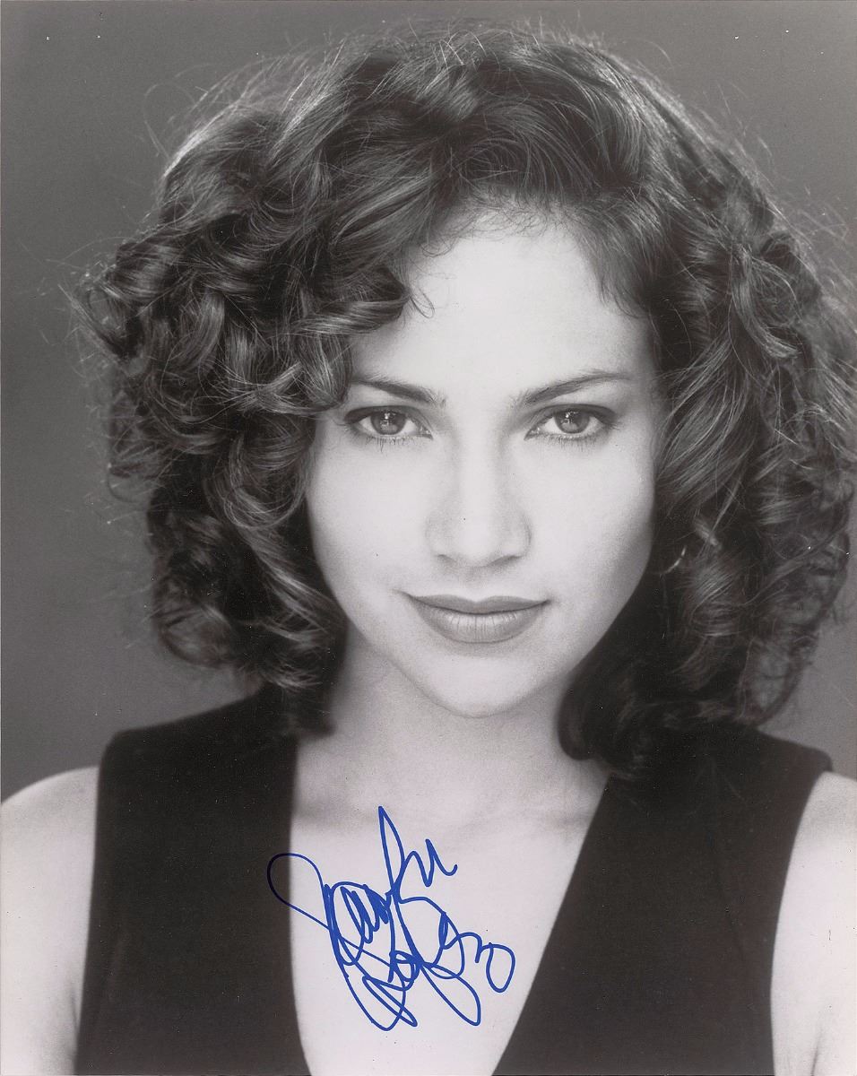 Glamorous satin-finish 8 x 10 close-up photo of a curly-haired Lopez, signed in blue felt tip. In fine condition, with staple holes to upper corners.