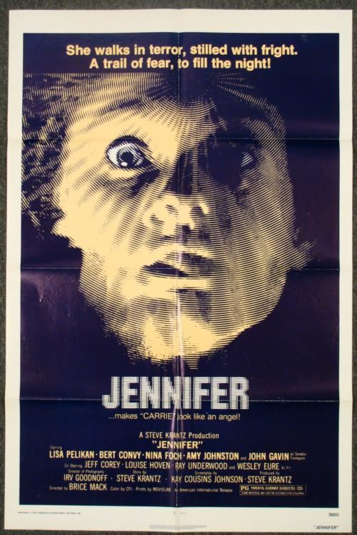 Here is an original poster from the 1978 horror movie Jennifer. In a nod to Carrie, this movie feature a female slasher, and this scary poster portrays her state of mind with a freaky distorted image. Size: 27 x 41 inches (one sheet) Condition: Good; light wear and tear through at the folds, and surface wrinkles
