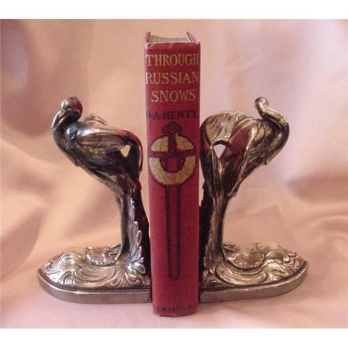 Stunning 1920's silver on metal flamingo bookends by Jenning Brothers. The flamingos are standing with uplifted wings giving a sense of movement. These great bookends measure 6 1/4" tall. The base measures 3 7/8" long by 3 1/4" wide. Each base is marked JB 3024. Nice heavy weight of 1 1/2 lbs. each. Very good condition.
