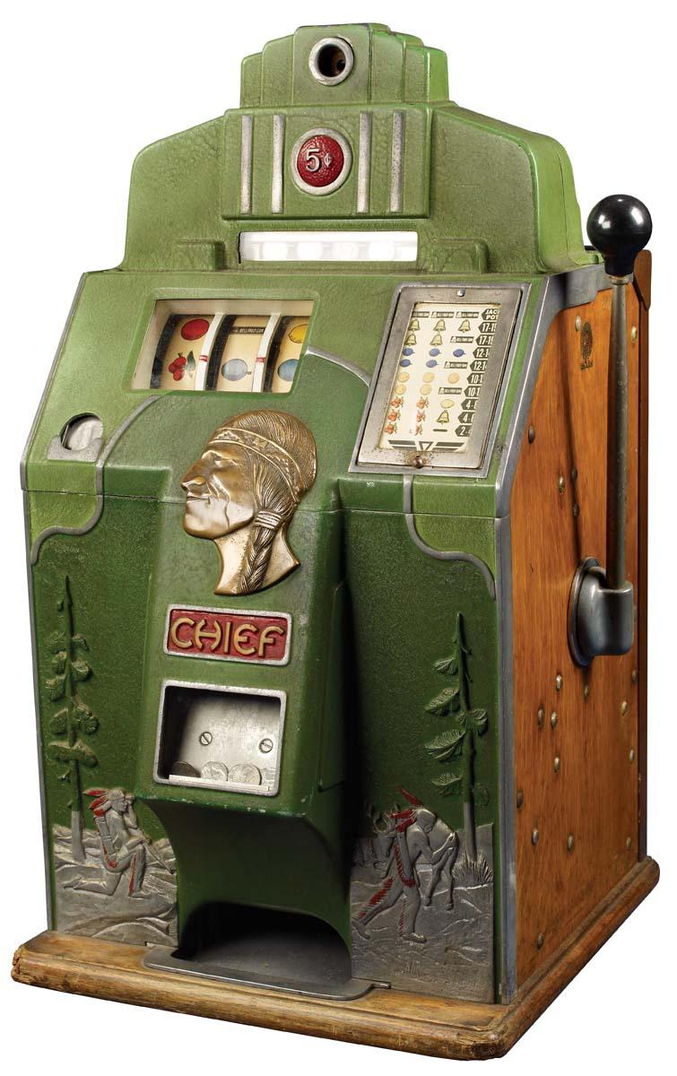 The "Hunting" early model 5 cent in great working order. Green cast case with Indian hunting scenes, oak sides with intact decals. c. 1930s.