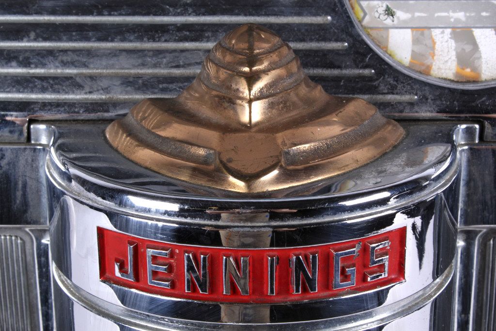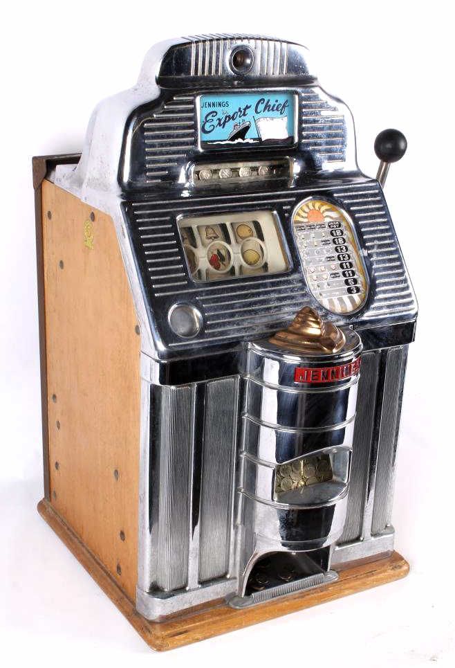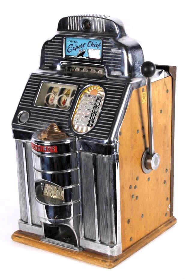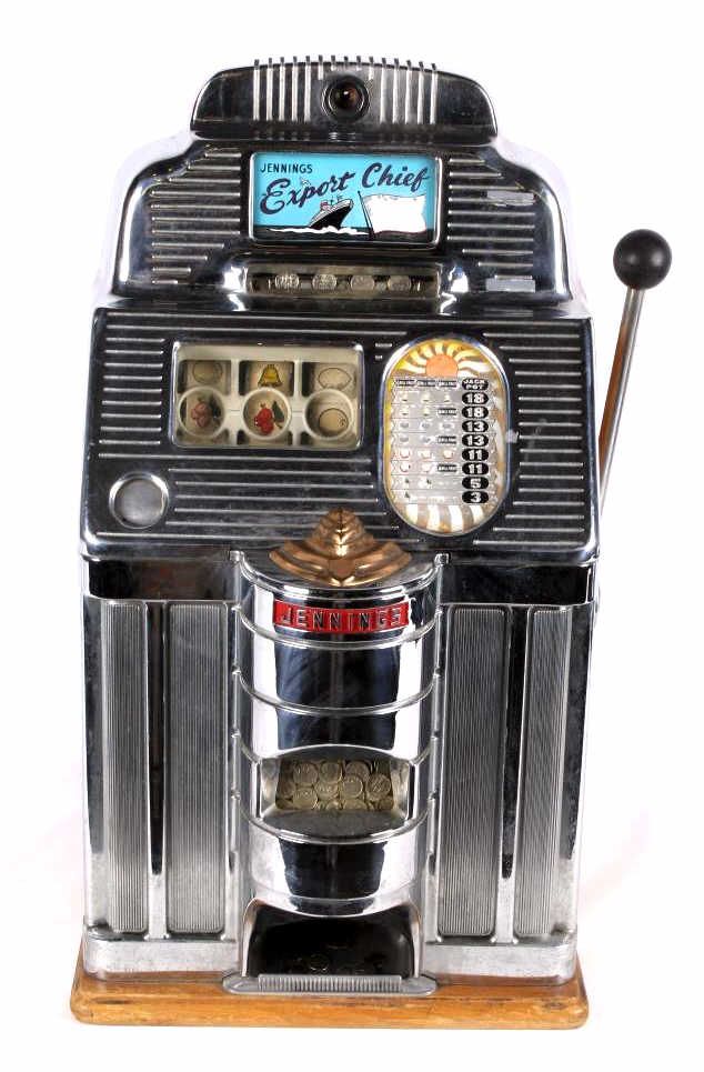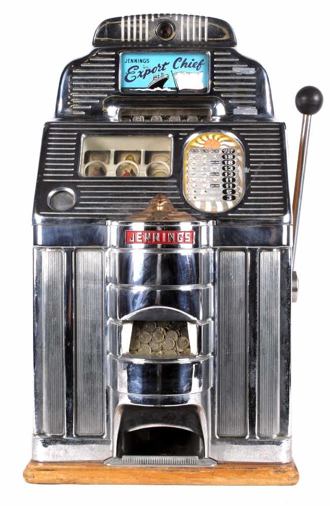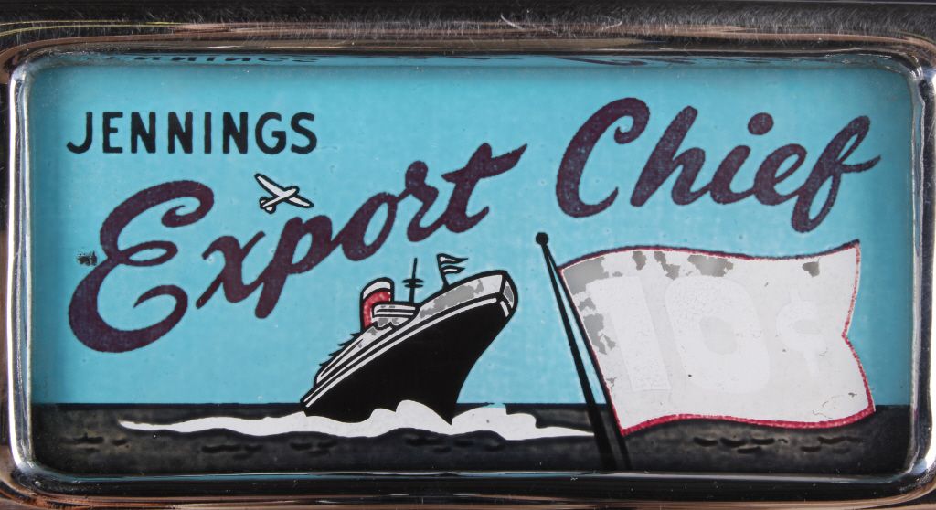 This is a O. D. Jennings & Co. 10¢ Export Chief slot machine. The piece shows a wonderful Art Deco nickel polished front and is believed to be all original. This good condition piece is from 1920-1930 and is a very rare model as it was Exported for commercial use. The machine does work. Measures approximately 17"x17.5"x27"