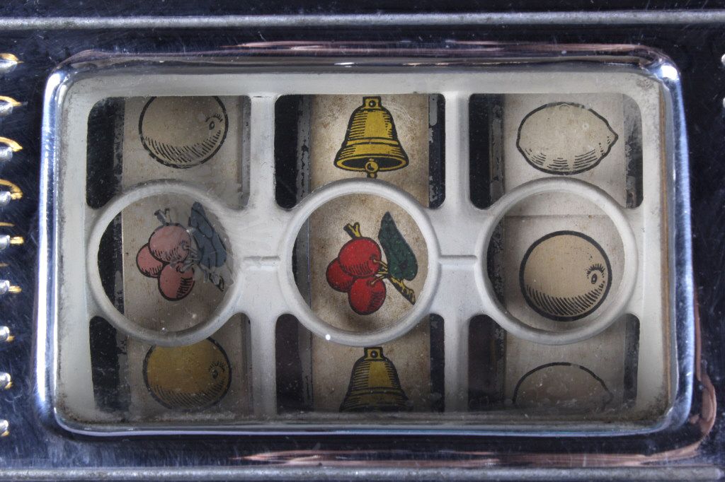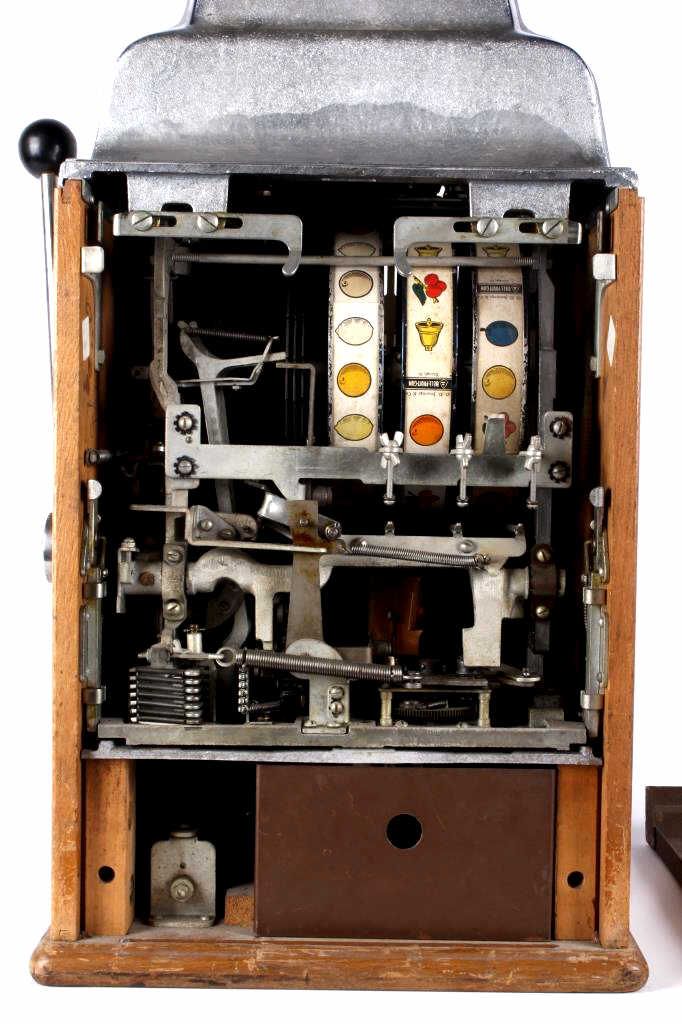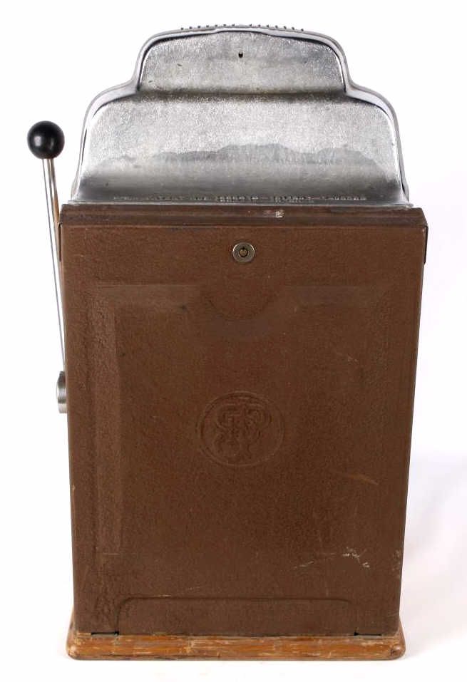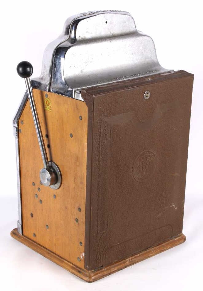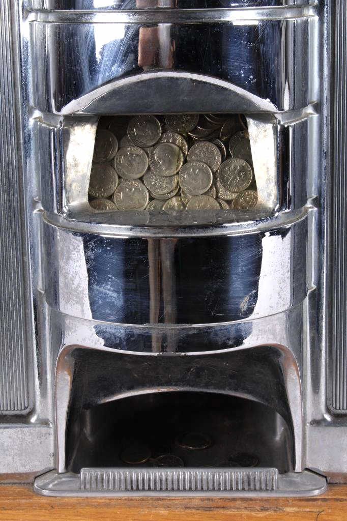 This is a O. D. Jennings & Co. 10¢ Export Chief slot machine. The piece shows a wonderful Art Deco nickel polished front and is believed to be all original. This good condition piece is from 1920-1930 and is a very rare model as it was Exported for commercial use. The machine does work. Measures approximately 17"x17.5"x27"