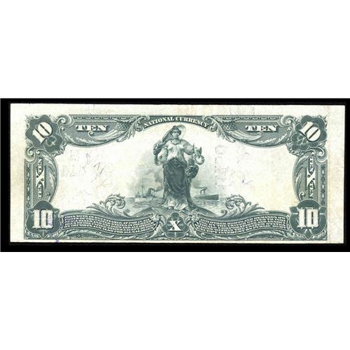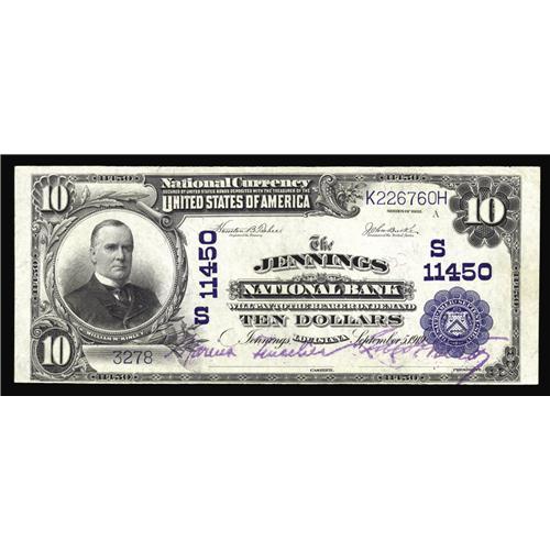 <B>Jennings, LA</B></I> - $10 1902 Plain Back Fr. 632 <B>The Jennings NB</B></I> Ch. # (S)11450<BR>The census here totals just eight pieces, most all from a small group turned up in the early 1970's and long since dispersed into a myriad of collections. In fact, these have been so well placed that our records show no offerings of any kind from here in the two decades since a 1986 Hickman & Oakes auction appearance. Bright <B>About Uncirculated,</B></I> a premium small town Louisiana example certain to see some spirited bidding.