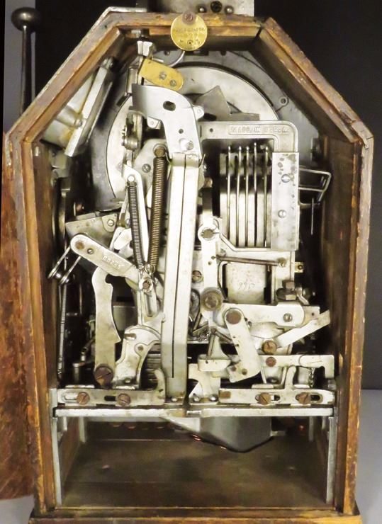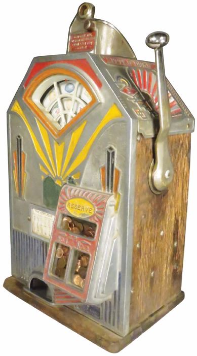 Jennings "Little Duke" One Cent Machine with Art Deco Face, 3 reels. Original working condition. Back door open but no lock. 14 1/2 X 25 X 12 inches.