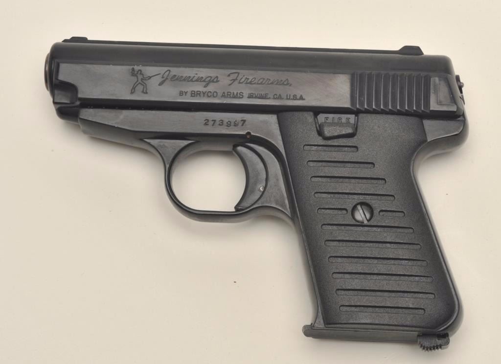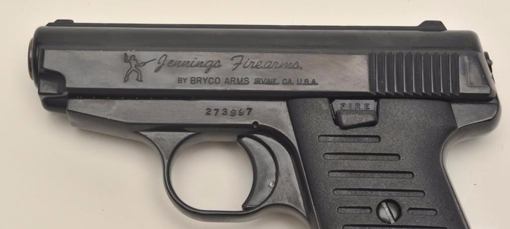 Jennings Model 38 semi-automatic pistol, .32 caliber, serial #273997. The pistol is in good overall condition with a 2 ¾” barrel. The pistol retains the majority of its black finish with small mars and muzzle wear. Thegrooved plastic grips are in good condition showing primarily handling marks. The bore is good, the action crisp and markings are legible. Est.: $40-$80.