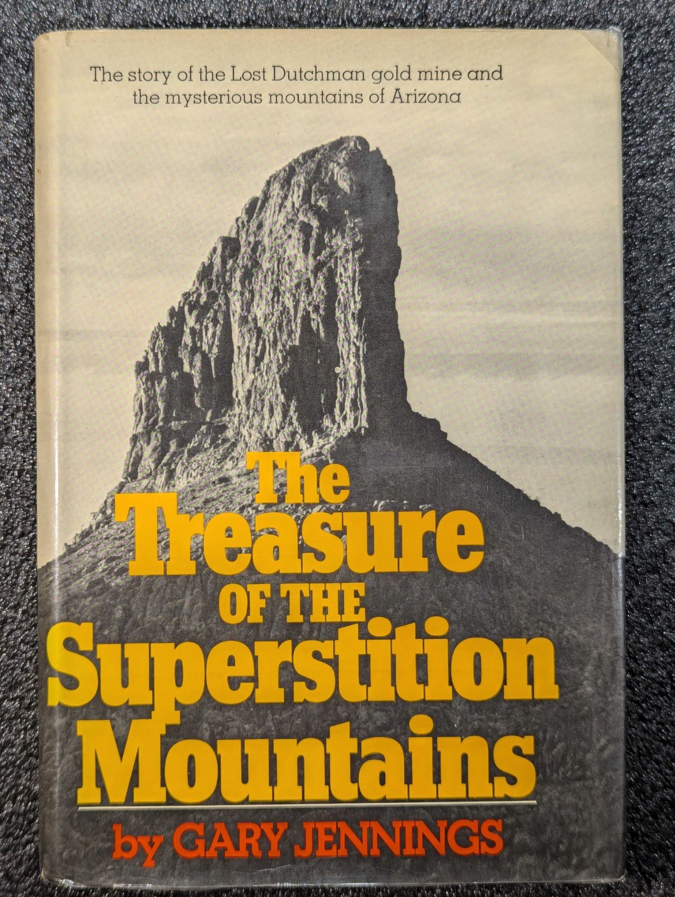 Jennings, Gary. THE TREASURE OF THE SUPERSTITION MOUNTAINS. W.W. Norton & Company, Inc., New York. 1973. 8vo. 247, (5) pages. original russet cloth, lettered in brown, protected jacket. Maps. B&w historic photos. Bibliography. English text.Ex Tucson Public Library. Very Good. Lot weight: 1 lbs 1oz. Subject(s): Buried Treasure, Lost Mines.
