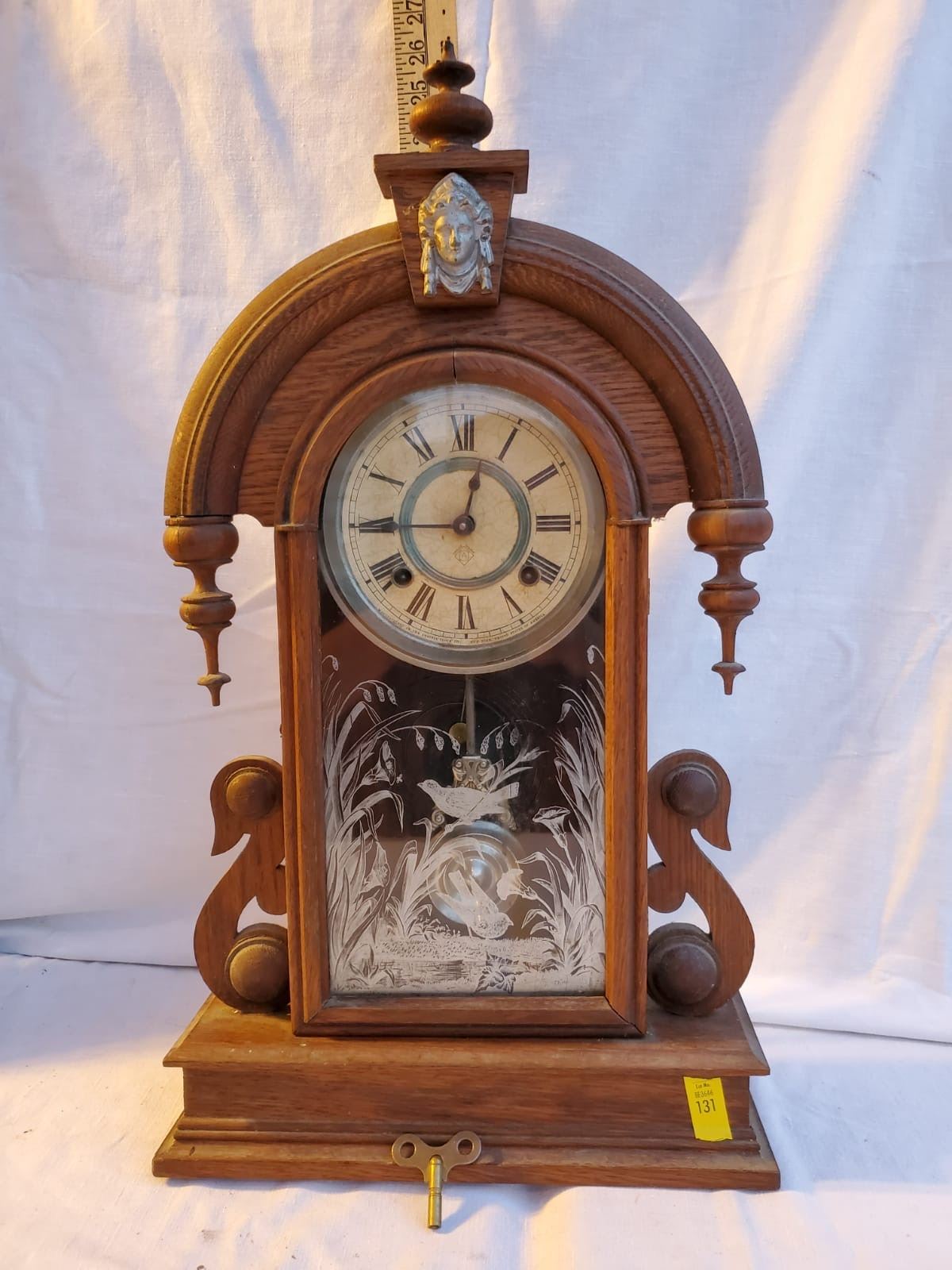 Circa 1880's Ansonia shelf clock with Jenny Lind, painted glass, key, and pendulum.