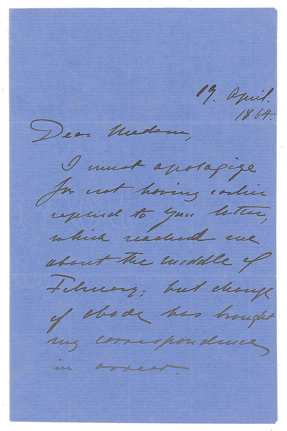 ALS signed “Jenny Lind-Goldschmidt,” four pages on two adjoining sheets, 4.5 x 7, April 19, 1864. Letter declining an invitation to New York amidst the Civil War, in part: "You will—I trust—easily understand that it is out of the question for me to comply with the request of the Board of the Sanitary Committee to come to New York to sing for your unfortunate brethren, the victims of this sad civil war! Apart from my domestic duties, and perhaps also the very different view from your which I take of the struggle which has originated the Institution for which you plead—the distance in itself will sufficiently explain why I cannot sensibly entertain your request." In fine condition. Accompanied by an unsigned engraving of Lind.
