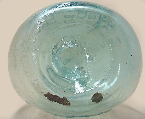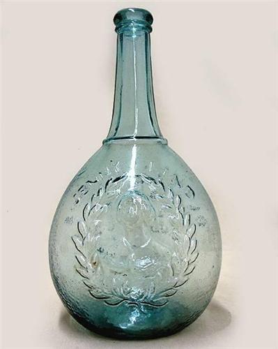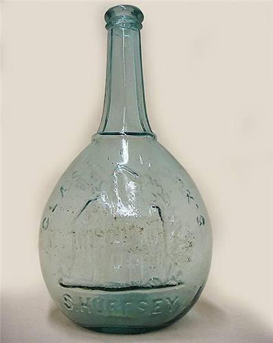 Jenny Lind bottle; flask; S. Huffsey Glass Works; aqua glass; open pontil; applied top; 19th C.; 11" high (no visible defects)