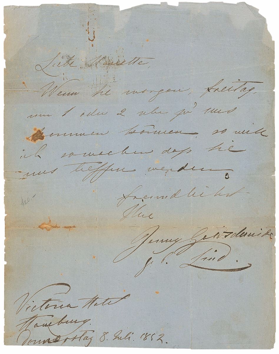 Celebrated soprano (1820–1887), known as the ‘Swedish Nightingale,’ who, under the management of P. T. Barnum, became the most renowned and highly paid singer of her day. Untranslated ALS in German, signed “Jenny Goldschmidt Lind,” one onionskin page, 8.25 x 10.5, July 8, 1852. Partial separations to intersecting folds (a horizontal fold passing just above the signature), several tears and small areas of paper loss (affecting a couple letters in her surname), and scattered staining and creasing, otherwise very good condition.