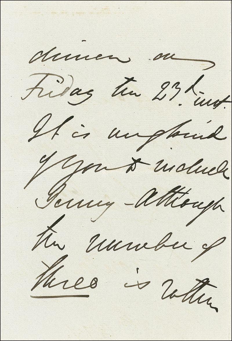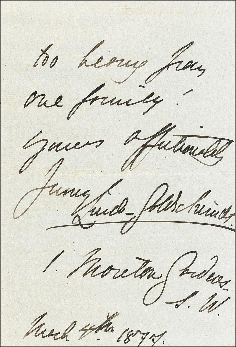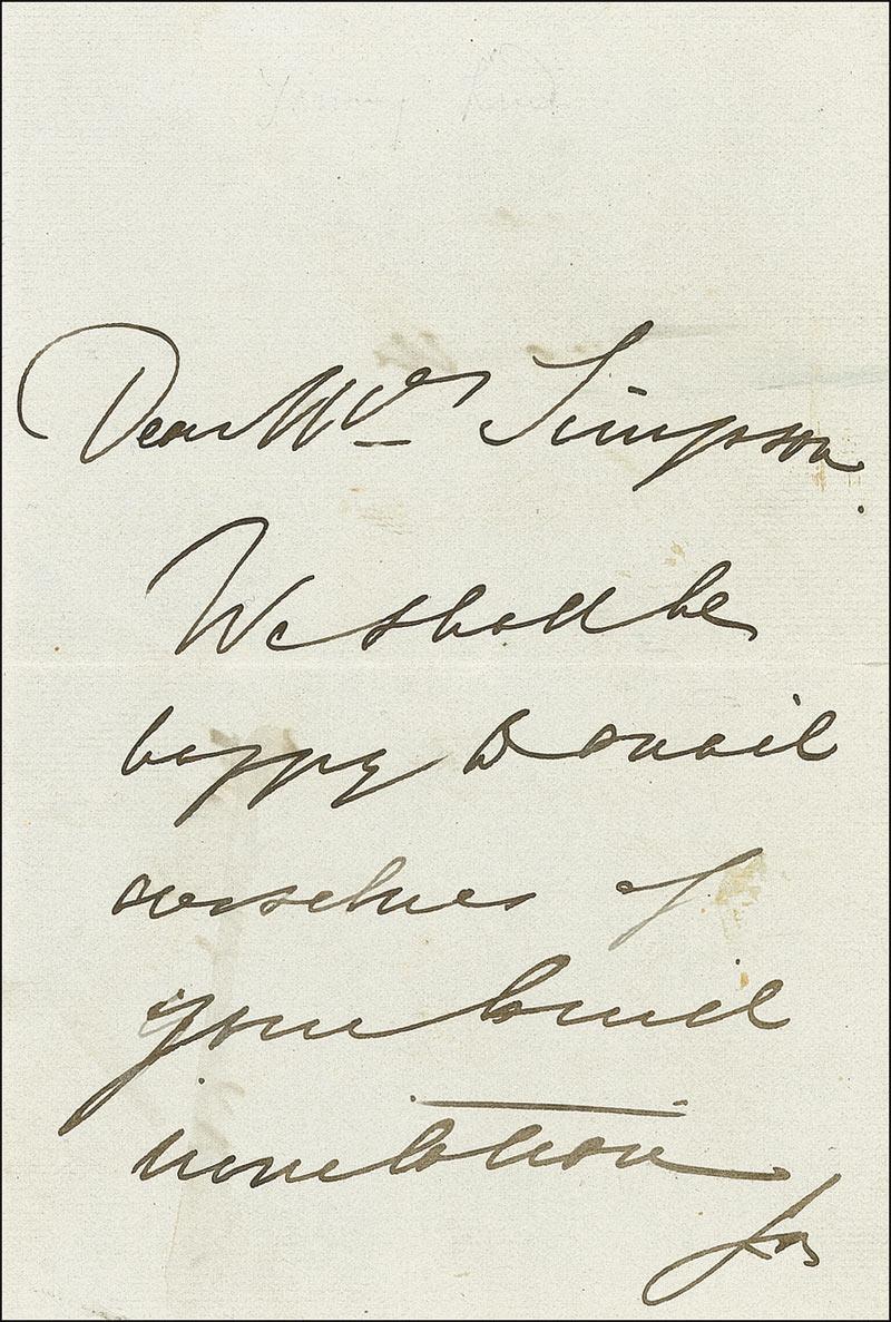 Celebrated soprano (1820–1887), known as the “Swedish Nightingale,” who, under the management of impresario P. T. Barnum, became the most renowned and highly paid singer of her day. ALS signed “Jenny Lind-Goldschmidt,” three pages on two adjoining sheets, 4 x 6, March 4, 1877. Letter accepting a dinner invitation. In part: “We shall be happy to avail ourselves of your kind invitation for dinner on Friday.” In fine condition, with a bit of scattered light toning. Pre-certified PSA/DNA and RRAuction COA.