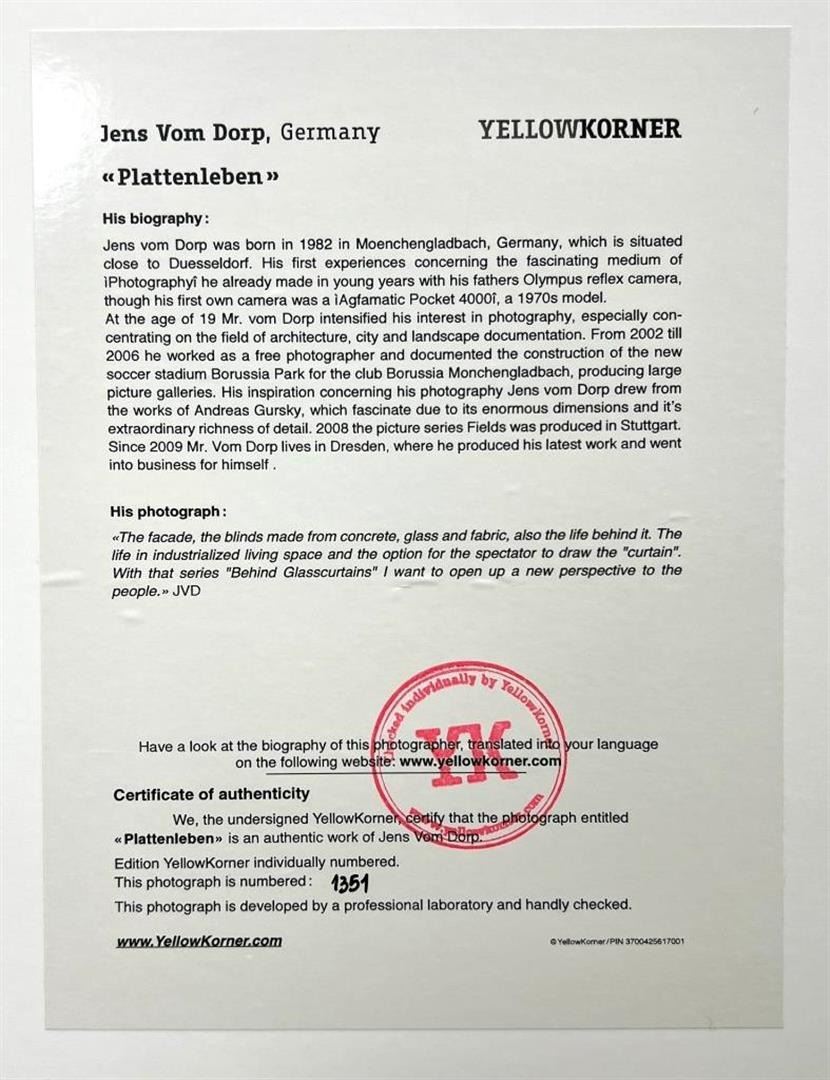 Jens Vom Dorp Germany Plattenleben YellowKorner Certified Photograph. Certificate of Authenticity from YellowKorner affixed to the back. Matted Dimensions 16"x20". Protected with Clear Mylar Sleeve.