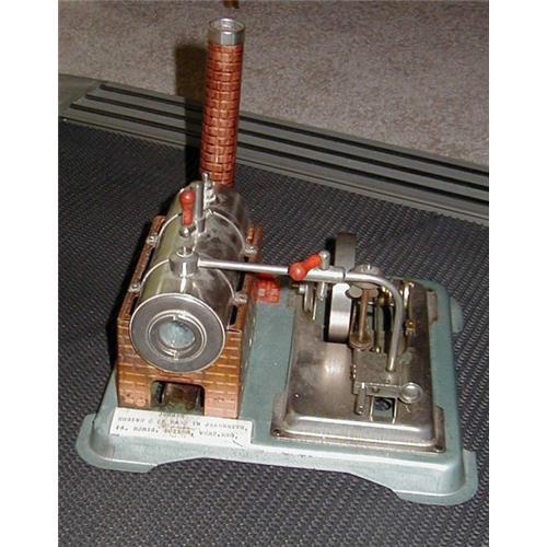 Jensen Mfg. Co. red label steam engine #65 with horizontal boiler, vertical engine. Has removable tower. Made in metal and aluminum with brown and red trim. I do not know how or if it works. Buyer pays shipping and handling costs.