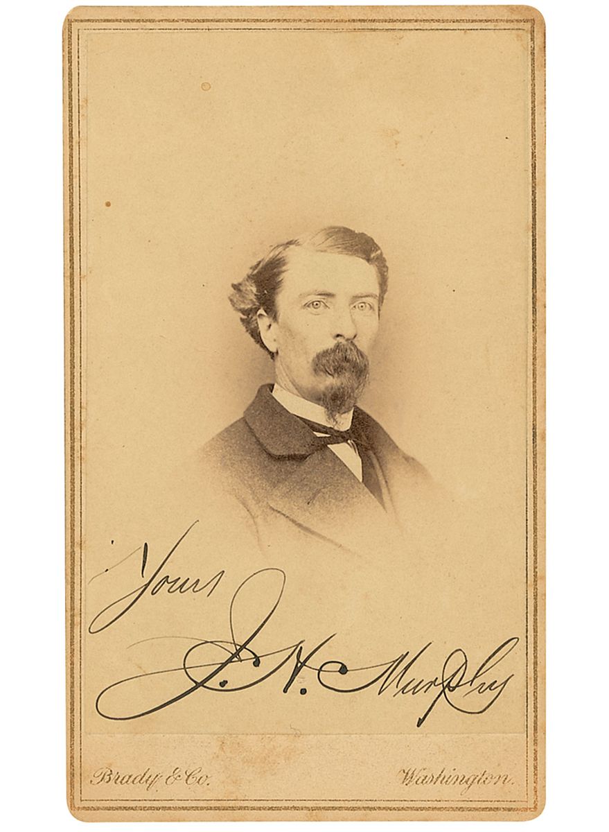 Iowa congressman (1835–1893) who served for two terms. Original 2.25 x 4 carte-de-visite photo by Brady of Washington, D. C., signed below the image in black ink, “Yours, J. H. Murphy.” A bit of scattered light toning and soiling to image and borders, otherwise fine condition.