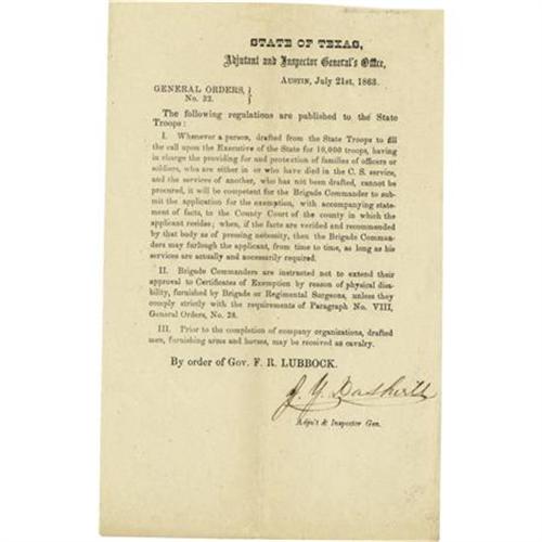 <B>Jeremiah Y. Dashiell Draft Exemption General Orders Signed</B></I> "<I>J.Y. Dashiell</B></I>" as Adjutant & Inspector General, one page, 5" x 8". Austin, July 21, 1863. General Orders No. 32, by order of Texas Gov. F.R. Lubbock, instructing the Brigade Commander to apply for an exemption if a person in the State Troops in charge of "<I>the providing for and protection of families of officers or soldiers who are either in or who have died in the C</B></I>[onfederate]<I>. S</B></I>[tates]<I>. Service</B></I>" is drafted. The orders also state that "<I>Prior to the completion of company organizations, drafted men, furnishing arms and horses, may be received as cavalry.</B></I>" During the Civil War, Jeremiah Y. Dashiell was a military advisor on the staff of Texas Gov. Francis R. Lubbock and Adjutant and Inspector General of the State of Texas. Fine condition.<BR><BR><b>Shipping:</b> Flat Material, Small (<a target="_blank" href="http://www.heritageauctions.com/common/shipping.php">view shipping information</a>)