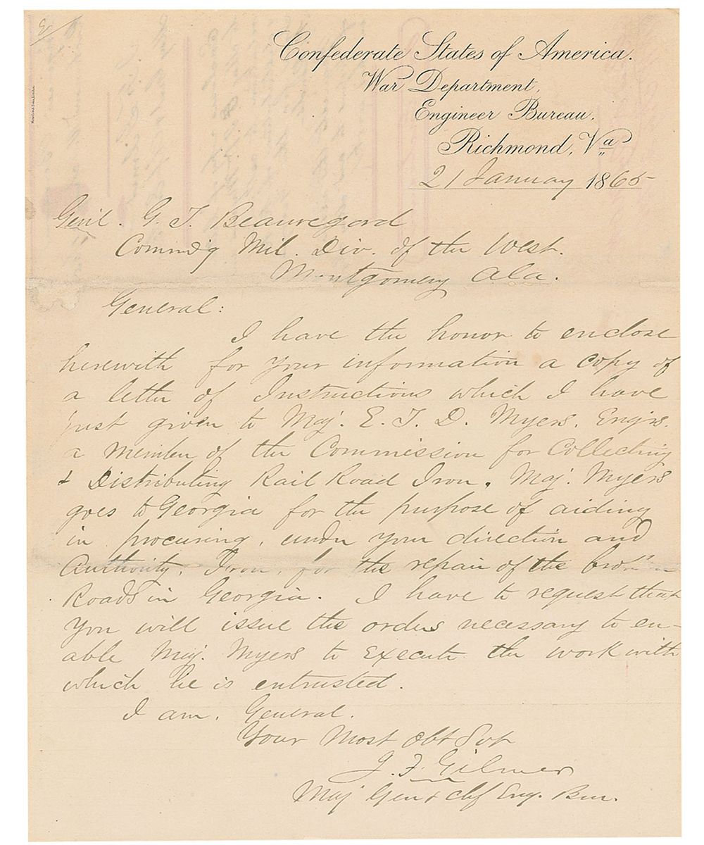 Chief engineer of the Confederate States Army (1818–1883). War-dated LS signed “J. F. Gilmer,” one page, 7.75 x 9.75, Confederate States of America, War Department letterhead, January 21, 1865. Letter to General G. T. Beauregard. In part: “I have the honor to enclose herewith for your information a copy of a letter of Instructions which I have given to Maj. E. T. D. Myers…a member of the Commission for Collecting & Distributing Rail Road Iron, Maj. Myers goes to Georgia for the purpose of aiding in procuring, under your direction and authority, Iron for repair of the broken Roads in Georgia.” Letter is inlaid to a slightly larger sheet. Repair to a complete separation to top horizontal fold and some light show-through from docketing on reverse, otherwise fine condition.
