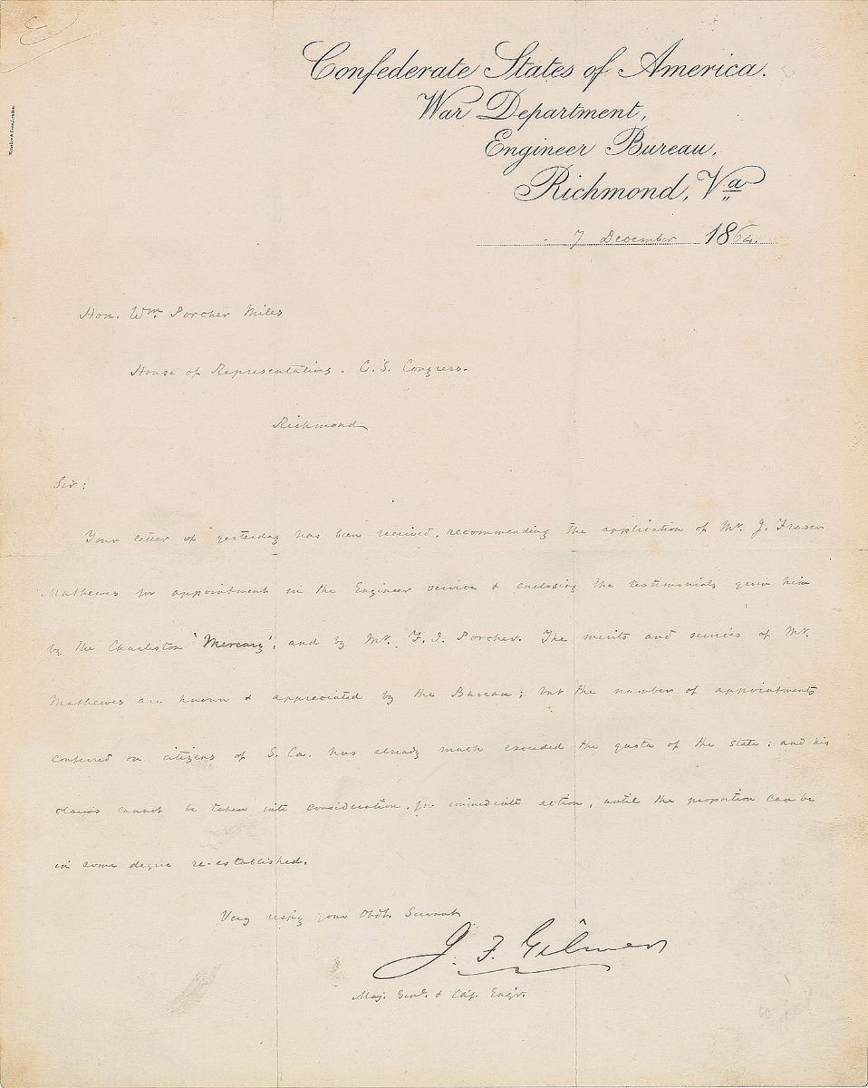 Chief engineer of the Confederate States Army (1818–1883). LS signed “J. F. Gilmer,” one page, 8 x 10, Confederate States of America War Department letterhead, December 7, 1864. Letter to Confederate Congressman William Porcher Miles, in part: “Your letter of yesterday has been received, recommending J. Fraser Mathews for appointment in the Engineer service & enclosing the testimonials given him by the Charleston ‘Mercury’…but the number of appointments conferred on citizens of S. Ca. has already much exceeded the quota.” Removably encapsulated in a mylar sleeve. In fine condition, with intersecting folds and light edge toning.