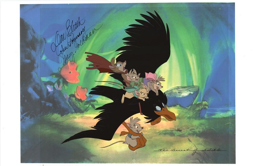 (Don Bluth Productions, 1982) Hand-painted limited edition cel featuring Jeremy, Mrs. Brisby, and children from The Secret of NIMH, numbered 1/100, signed in black felt tip by the film's producers: Don Bluth, Gary Goldman, and John Pomeroy. The cel is placed on a color copy background. Image measures 7.75 x 9.25, with overall dimensions of 17 x 11. A desirable example of the first number (1) in a small edition of 100.