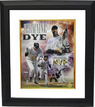 Jermaine Dye won the World Series MVP with the White Sox in 2005. Dye bats and throws right-handed and, in his prime, was known for his ability to hit for power and his powerful throwing arm. Jermaine Dye has hand autographed this Chicago White Sox Collage 16x20 with 05 WS MVP inscription. Leaf Authentics Hologram and Certificate of Authenticity from Athlon Sports. Custom White Mat and Premium Black Frame as shown.