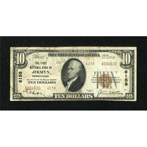 <B>Jermyn, PA</B></I> - $10 1929 Ty. 2 <B>The First NB</B></I> Ch. # 6158<BR> Another opportunity to pick up a scarce small size on this bank and a different type. It is a <B>Fine</B></I> Type Two with a little bit of dirt holding it back from a higher grade.<BR><I>From The Kansas City Collection</B></I><BR><BR><b>Shipping:</b> Coins & Currency (<a target="_blank" href="http://www.heritageauctions.com/common/shipping.php">view shipping information</a>)