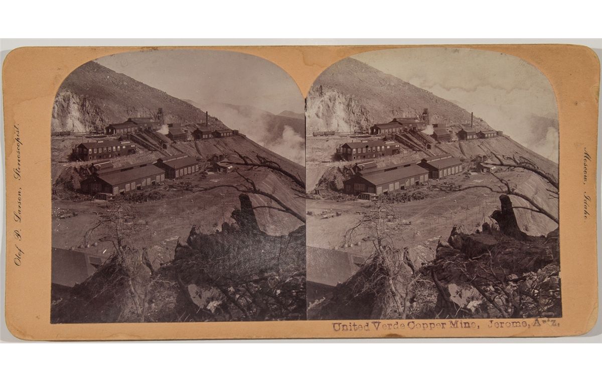 c1900 Mountain side view of the United Verde Copper Mine near the town of Jerome. The caption reads ""United Verde Copper Mine, Jerome, Ariz." The photographer was "Olaf P. Larson, Stereoscopist." He was from Moscow, ID. This card is in excellent condition, with great clarity and contrast. It shows only minor wear at the edges, with some very small stains at the top. Jerome was founded in the 19th century, and is located above 5,000 feet in elevation in the Black Hills near Prescott. The United Verde Copper Mine was said to have produced almost 33 million tons of copper, gold, silver, lead and zinc over its 77 year (1876-1953) life span. Bud Bassett Collection - HKA#65562