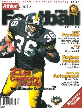 This is an Athlon Sports 1997 Pro Football Magazine with Pittsburgh Steelers Runningback Jerome Bettis on the cover. This Preview has team analysis, predictions, lineups, rosters and more for the 1997 Season