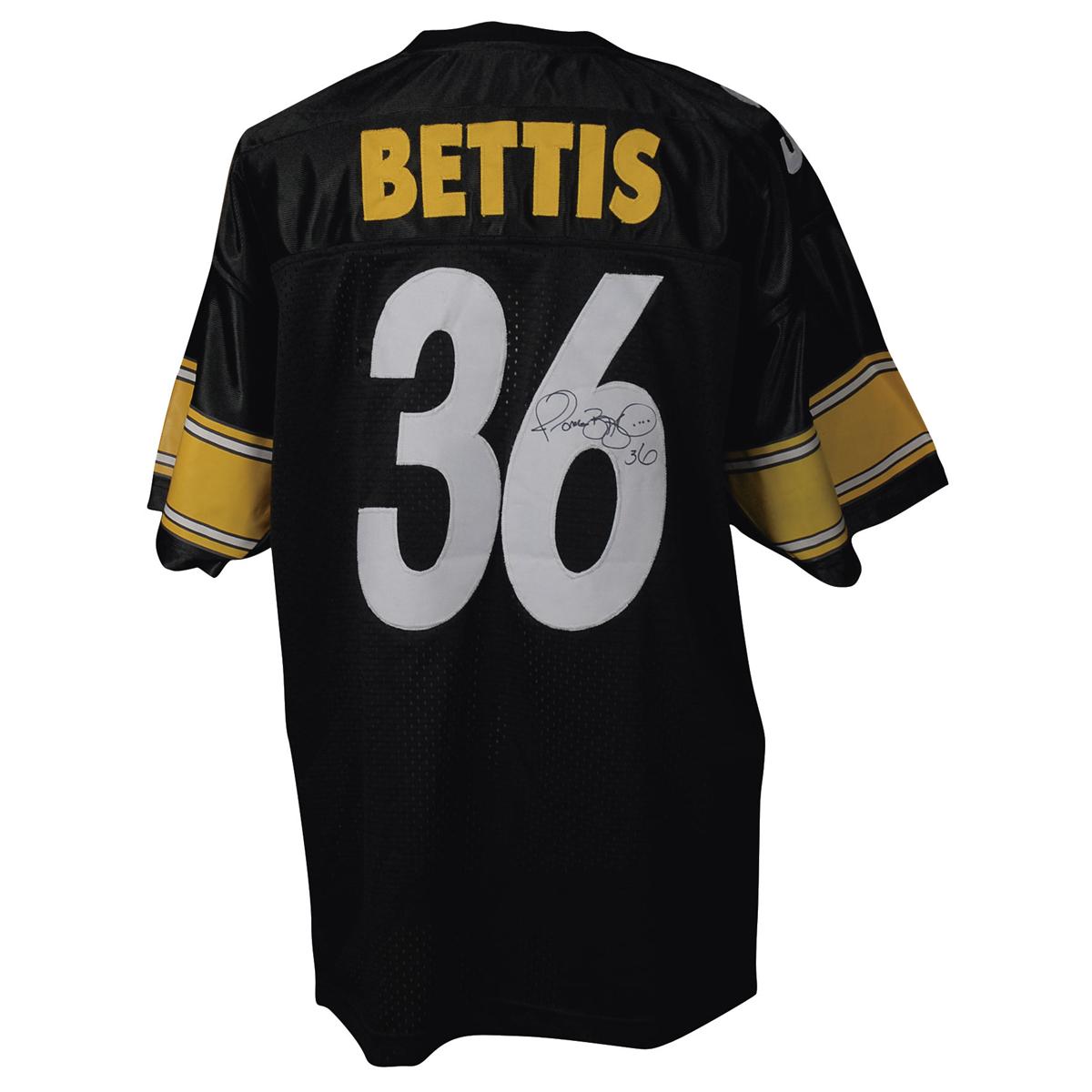 Replica Pittsburgh Steelers football jersey, with sewn on letters and numbers, signed in black felt tip on the number on the back, “Jerome Bettis, 36.” In very fine condition.