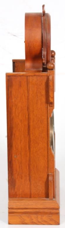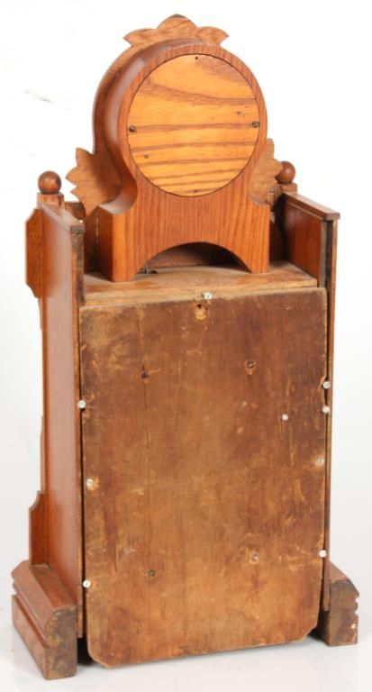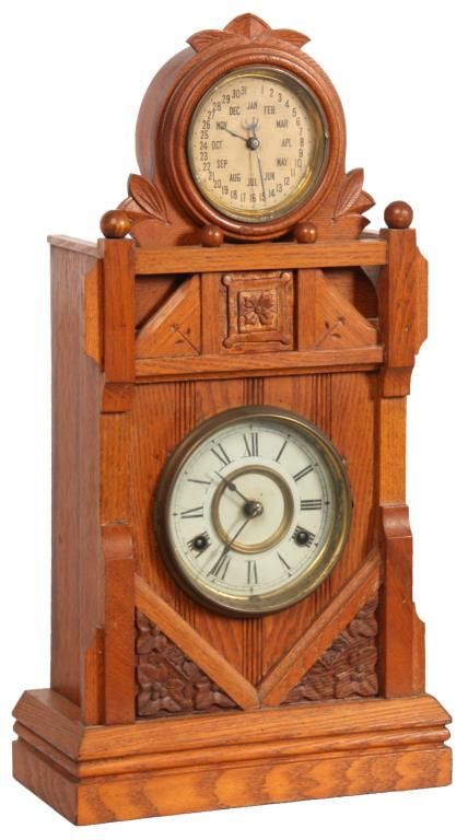 Jerome & Co. Calendar Shelf Clock. 5 in. painted metal dial has a brass bezel with door glass, black Roman hour numerals and blued spade hands. Pierced brass spring driven movement has an half hour count wheel strike mechanism, coiled gong and signed New Haven Clock Co.; 4 in. paper dial at top of the case with Jerome & Co. perpetual calendar mechanism, blued hands indicating 31 dates and 12 months, calendar mechanism is connected to the time mechanism by a rod running through the case. The oak case has an aesthetic design with drum shaped top, leaf carving and turned spherical mounts, in good condition and original finish; both the time piece and the calendar mechanism are in good running condition. 21 in. high x 11 in. wide x 5.25 in. deep.