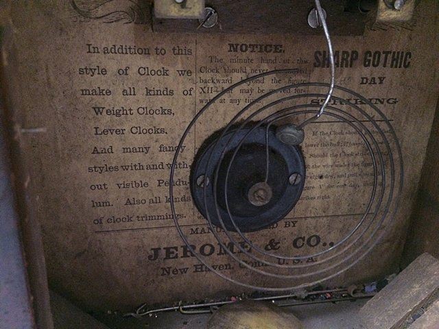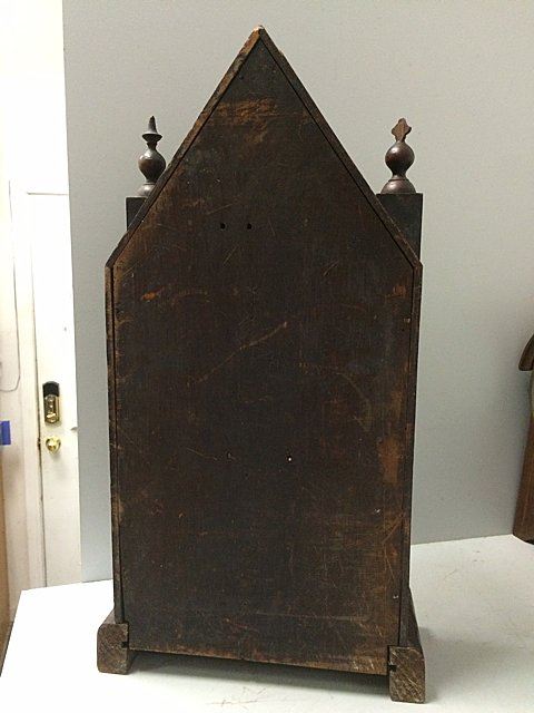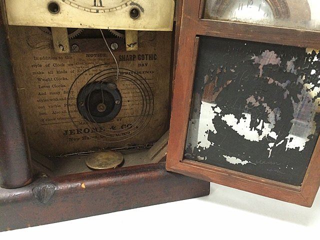 Jerome & Co. Steeple Clock, New Haven, CT., all original with weights and pendulum steeple clock, reverse painted lower glass has some loss, original finish and finials, very nice label "Jerome & Co., New Haven, Conn. U.S.A.