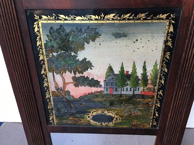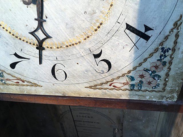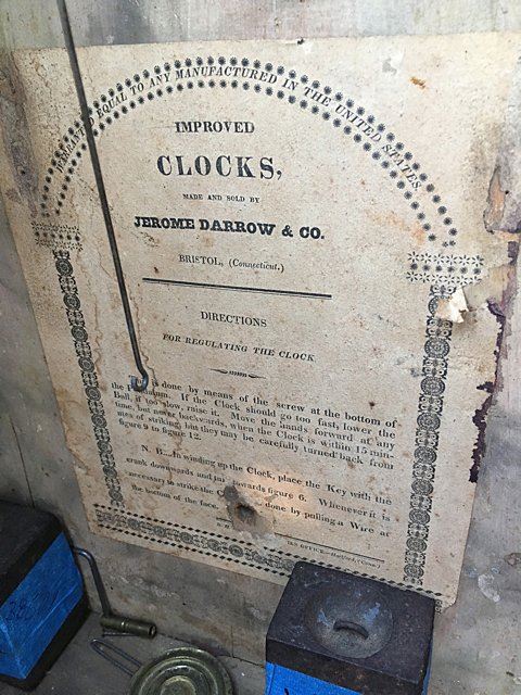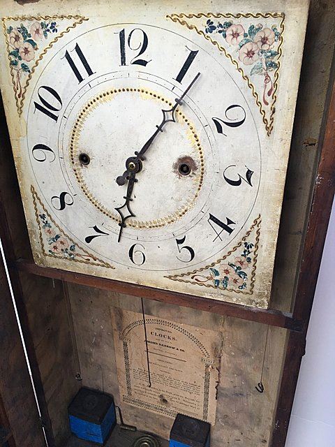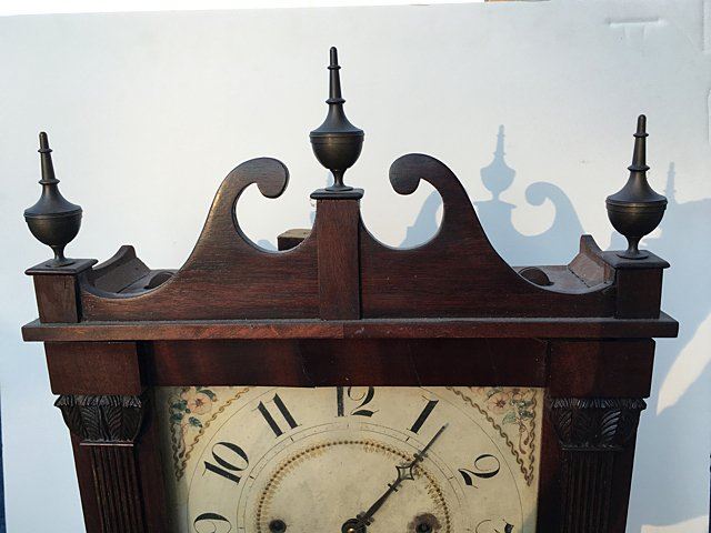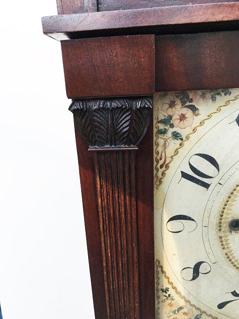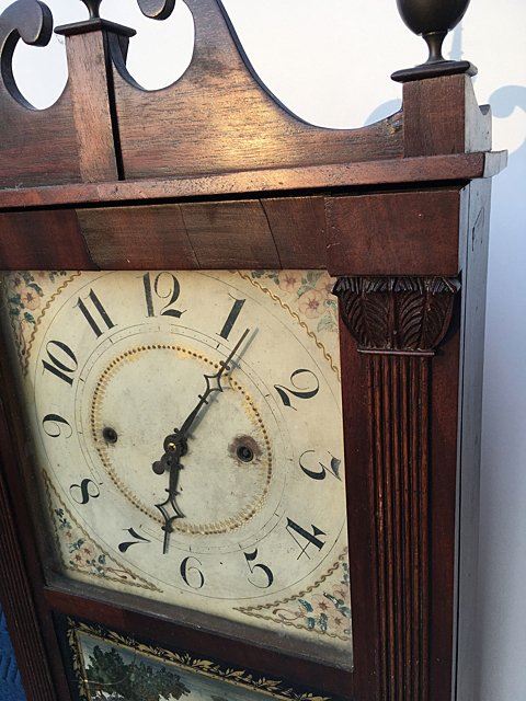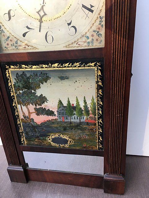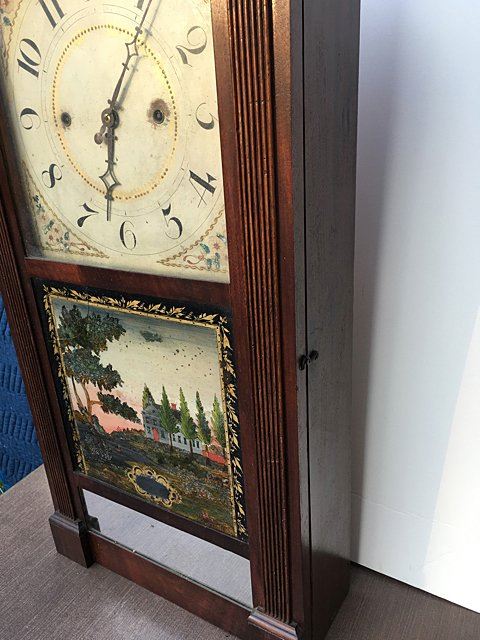 Jerome, Darrow & Company, Bristol, CT, 30 hour wood movement time/strike with reeded pilaster and scroll top. Mahogancy case, acanthus carved leaves on top of columns, hand painted dial, reverse painted glass, and mirrored bottom tablet with 3 brass finials, and beautiful paper label, circa 1828 Ð 1833. Measures approx. 38" tall x 15 1/2" wide x 5" deep.