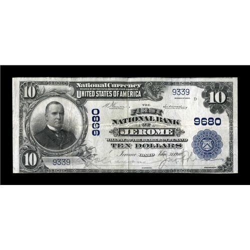 <B>Jerome, ID</B></I> - $10 1902 Plain Back Fr. 627 <B>The First NB</B></I> Ch. # 9680<BR>Appearances by any examples from this bank are few and far between as the number of individuals named Jerome outweighs the number of notes known, which stands at seven. The stamped signatures have survived well on this piece from the only bank in this small community.<BR><BR><b>Shipping:</b> Coin/Currency (<a target="_blank" href="http://www.heritageauctions.com/common/shipping.php">view shipping information</a>)