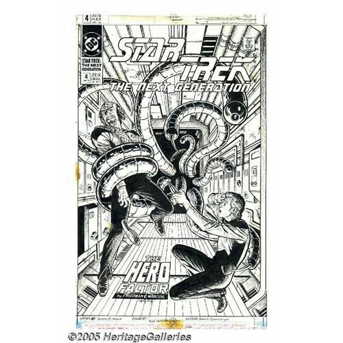 <B>Jerome Moore - Star Trek: The Next Generation #4 Cover Original Art (DC, 1990).</B></I> An away team lead by Lt. Riker is trapped aboard a derelict starship, which was designed to collect biological samples. Worf and chief engineer McRobb are the only two members who were not placed in stasis, and must battle the ship for their freedom. Jerome Moore's highly individual style graces this cover illustrating the interior story, ""The Hero Factor,"" written by Michael Jan Friedman. The image area measures 10"" x 15"" and the condition is Excellent. Includes the original logo and masthead art. <BR><BR><B>Important notice:</B> Heritage usually auctions material at the rate of 200-250 lots per hour. On some occasions eBay Live bid software or the Internet may not be able to keep up with the pace of the auction. We recommend placing a realistic absentee bid now as insurance to avoid disappointment. Occasionally the auctioneer may eliminate or reject an eBay Live bid, and the auctioneer may also reopen a lot after the close of the eBay live bidding (usually because we missed an audience bid), and may reject your bid even if it shows you as the winning bidder. By bidding via eBay Live, you agree that Heritage may award the lot to another bidder at its sole discretion under the circumstances described above or any other reasonable circumstances. Since eBay bids are not shown to us until we open the lot on the floor, we treat those bids just like floor bids. In most cases the floor responds before the eBay bid is presented to us, due to Internet lag time, so for consistency we have made it a policy that floor bids are always considered first over tie eBay live bids. Also please note that all Heritage lots purchased through eBay Live carry a 20% Buyer's Premium. Please make sure you read the Terms and Conditions before you bid. This lot is being auctioned in conjunction with a live floor auction by Heritage Galleries & Auctioneers. All final auction and invoice information wi