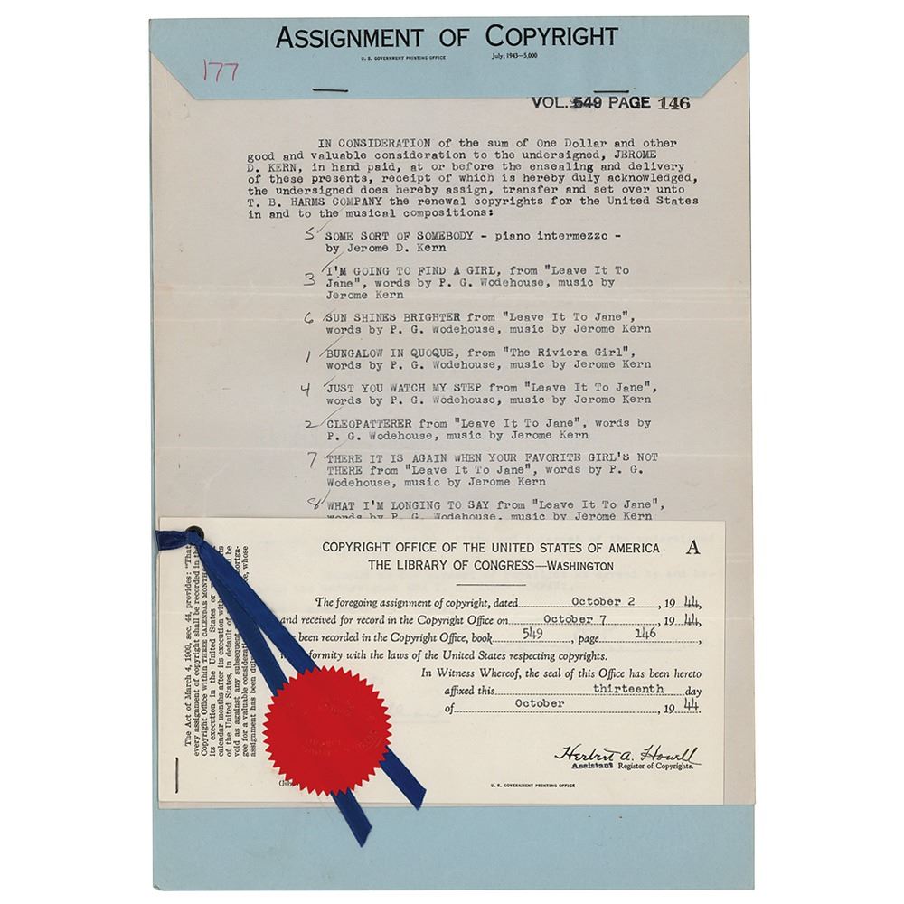 DS, signed "Jerome D. Kern," one page, 8.5 x 10, October 2, 1944. Kern assigns the copyrights of eight works from his musicals with P. G. Wodehouse to the T. B. Harms Company, including 'I'm Going to Find a Girl,' 'Cleopatterer,' and 'What I'm Longing to Say.' Rider bearing a ribbon and Library of Congress seal is stapled to the lower portion, and document is stapled into an 'Assignment of Copyright' folder at the top. In fine condition.