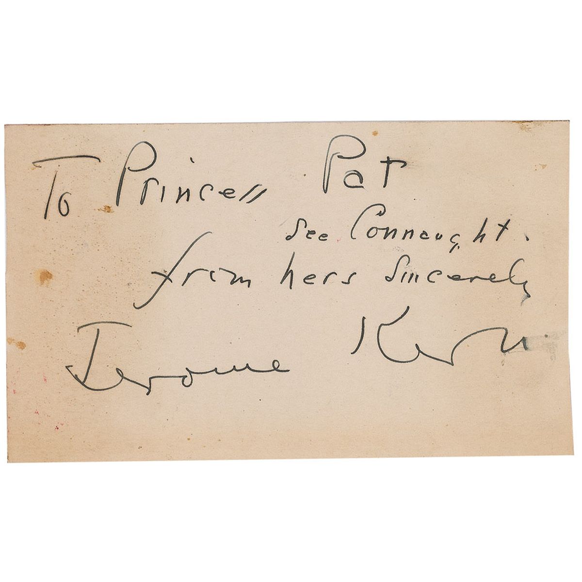 Vintage ink signature and inscription, “To Princess Pat, see Connaught, from hers sincerely, Jerome Kern,” on an off-white 5 x 3 card. In very good condition, with toning, scattered light soiling and foxing, and light brushing to the end of the signature.
