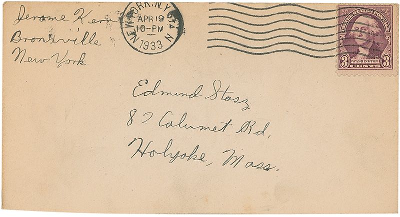 AMQS at the bottom of a young boy’s 1933 letter to Kern seeking his autograph. Letter measures 5.25 x 5.5 with Kern adding a four-bar AMQS from ‘Music in the Air,’ signed underneath the quote by Kern. In fine condition, with some mild toning and a crease to lower right corner. Accompanied by the original mailing envelope.