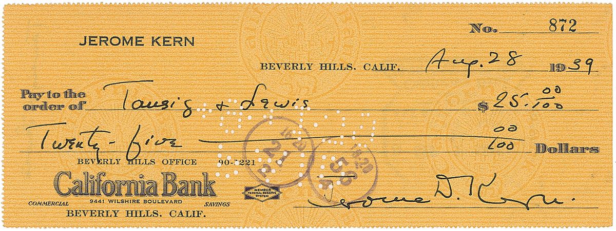 Personal check, 8.25 x 3, filled out and signed by Kern, “Jerome T. Kern,” payable to Tansig & Lewis for $25.00, August 28, 1939. Several vertical folds and expected cancellation holes and stamps slightly affecting first couple of letters of signature, otherwise fine condition.