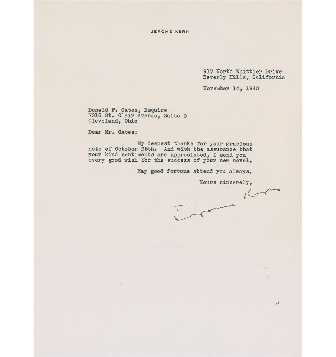 TLS, one page, 8.5 x 11, personal letterhead, November 14, 1940. Letter to Donald F. Gates, in part: “My deepest thanks for your gracious note of October 25th. And with the assurance that your kind sentiments are appreciated, I send you every good wish for the success of your new novel.” In fine condition.