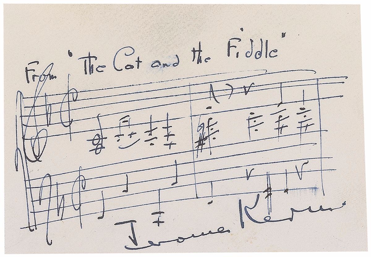 Rare AMQS on an off-white 4.25 x 3 sheet. Kern pens two bars of music, identifying it at the top, “From ‘The Cat and the Fiddle,’” and signing below, “Jerome Kern.” In fine condition. The Broadway hit opened in October 1931 and ran for nearly 400 performances. A superb example and one of few Kern AMQSs we have offered.