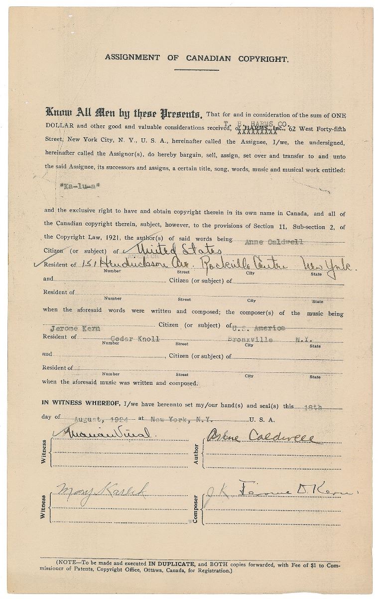 DS, signed “Jerome D. Kern,” one page, 8 x 13, August 18, 1924. Assignment of Canadian Copyright contract for the “musical work entitled: ‘Ka–lu–a.’” Signed at the conclusion by Kern as the composer. In very good to fine condition, with creasing and staple holes to the upper left corner.