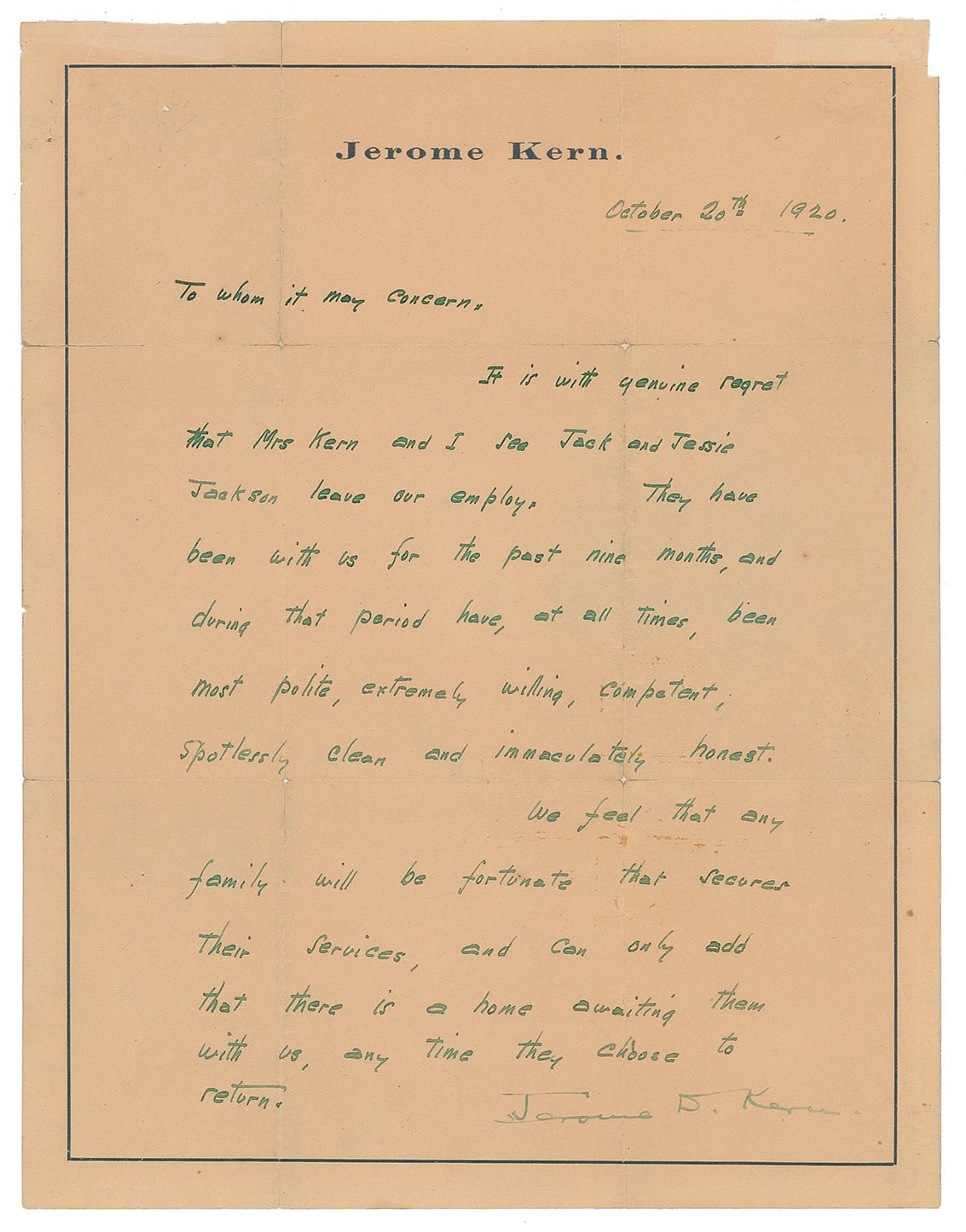 ALS signed “Jerome D. Kern,” one page, 8.25 x 10.75, personal letterhead, October 20, 1920. A letter of recommendation for Kern's two housekeepers, In full: "It is with genuine regret that Mrs. Kern and I see Jack and Jessie Jackson leave our employ. They have been with us for the past nine months, and during that period have, at all times, been most polite, extremely willing, competent, spotlessly clean and immaculately honest. We feel that any family will be fortunate that secures their services, and can only add that there is a home awaiting them with us, any time they choose to return." In very good to fine condition, with the intersecting folds reinforced on the reverse.