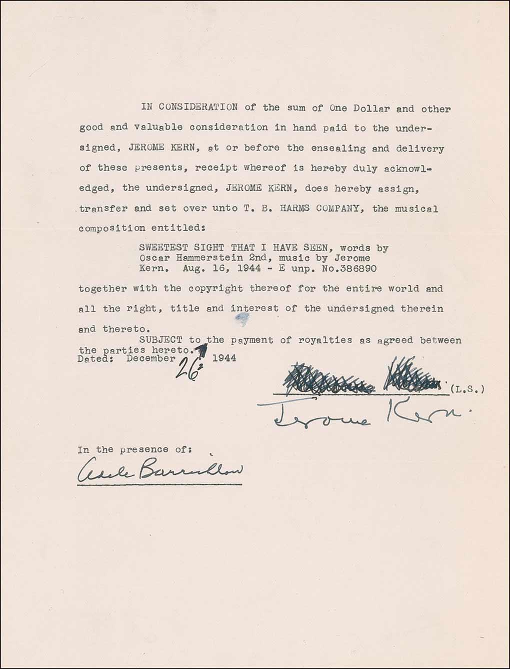 DS, one page, 8.5 x 11, December 26, 1944. Kern, for the consideration of one dollar, sells the rights to his song “Sweetest Sight That I Have Seen,” to the T. B. Harms Company. Signed at the conclusion in black ink, below a crossed out signature. In fine condition, with a staple hole to top left.