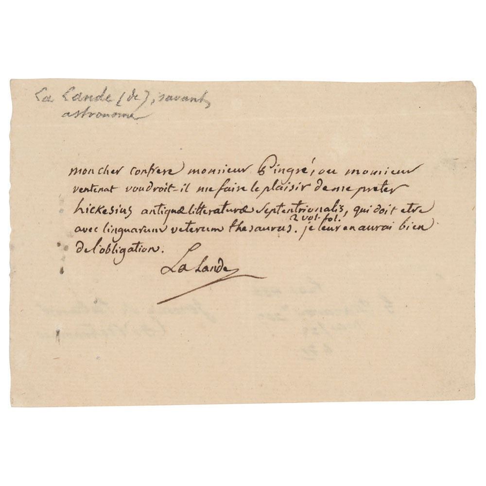 ANS in French, signed “La Lande,†one page, 4.25 x 3, no date. Untranslated handwritten note concerning some antique Latin books. In very good to fine condition.