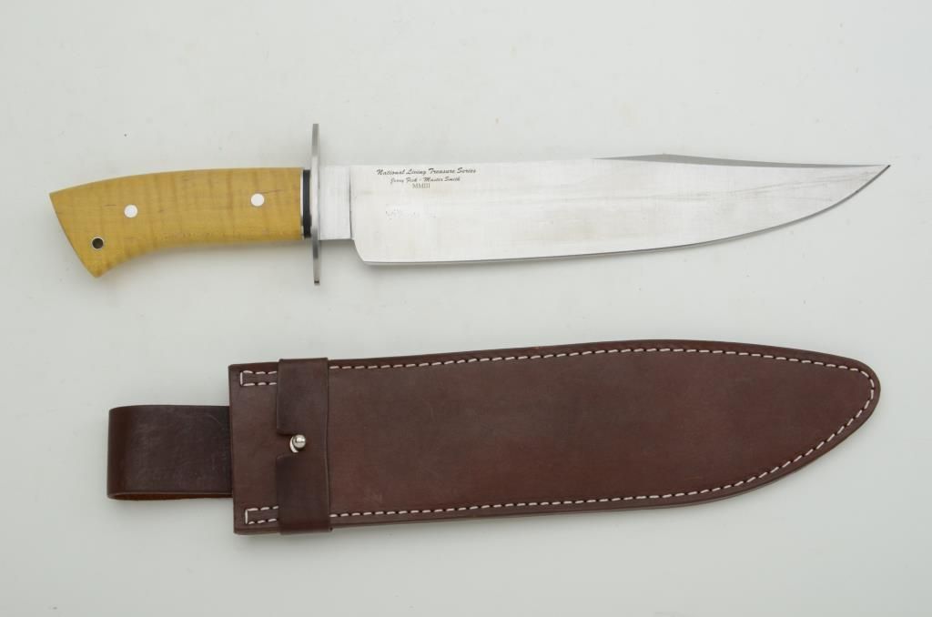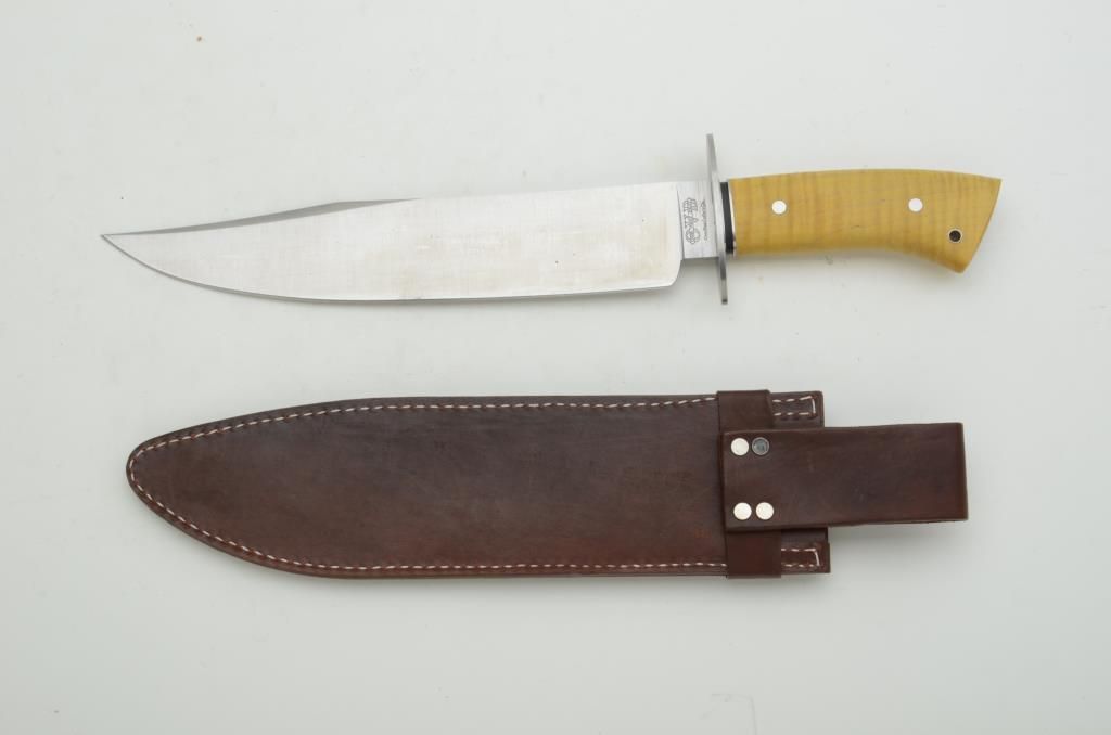 Jerry Fisk, Master Smith large modern knife marked “National Living Treasure Series”, approx. 16-1/2” overall with an approx. 11” blade with maple grip and heavy leather sheath, both in like new condition. Est.:$400-$800.