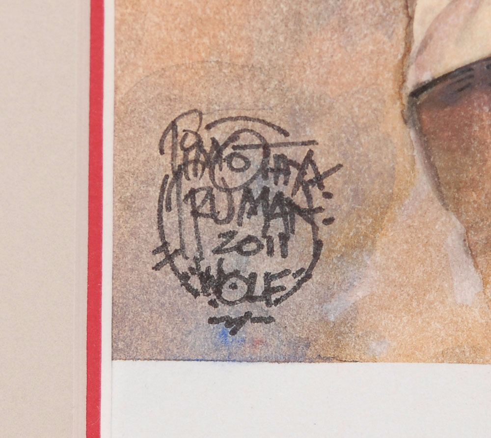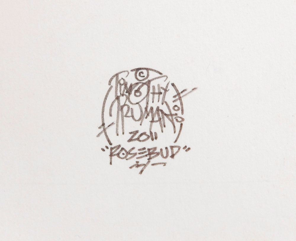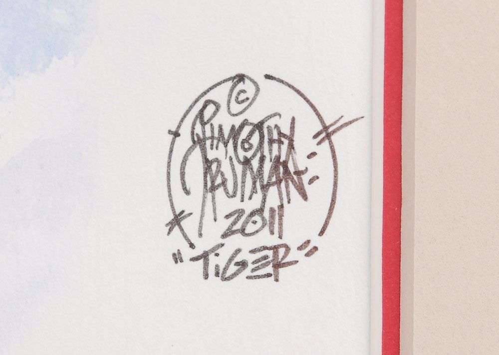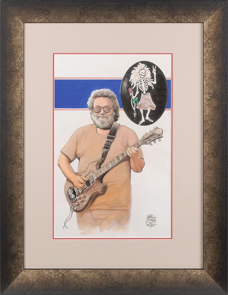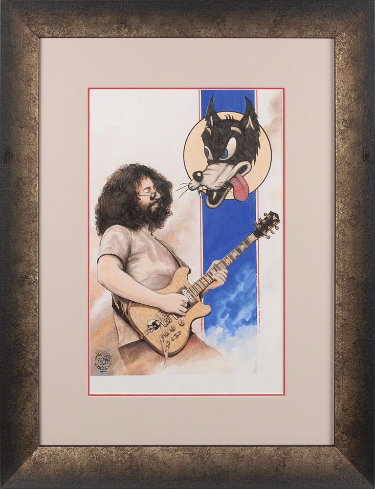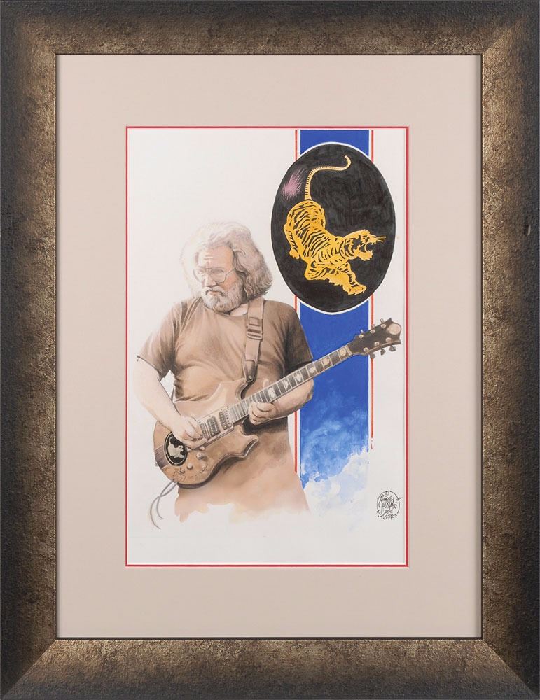 Collection of three original hand-painted gouache artworks depicting Garcia playing his guitars "Wolf," "Rosebud," and "Tiger," 9.75 x 15, all signed in black ink in a lower corner by artist Timothy Truman, dated 2011, and labeled with the name of the guitar. Each is professionally framed with acid-free matting, archival hinges, and UV-resistant museum glass to an overall size of 19 x 25. In overall very fine condition. An exceptional chronicle of the guitars Garcia famously played throughout his career.