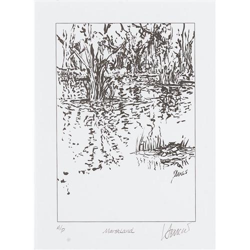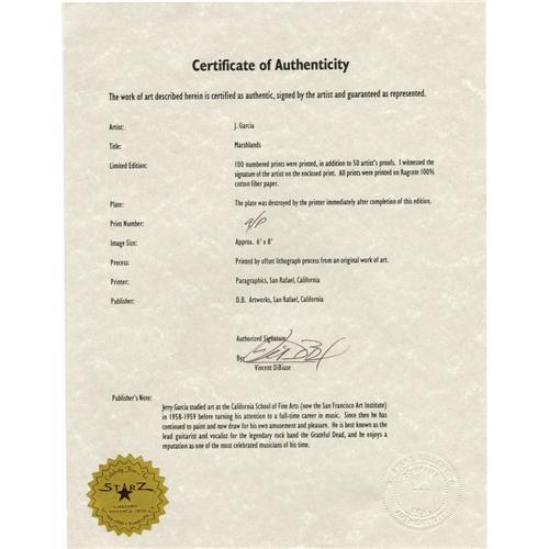 <B>Jerry Garcia "Marshlands" Drawing.</B></I> A limited edition 6" x 8" lithograph print of a drawing titled "Marshlands" by the late Grateful Dead frontman, one of 50 artist prints hand-signed by Garcia. Matted and framed to an overall size of 17" x 19.5" and in Excellent condition. <I>Accompanied by a certificate of authenticity.</B></I><BR><BR><b>Shipping:</b> Framed - with Glass, Small (<a target="_blank" href="http://www.heritageauctions.com/common/shipping.php">view shipping information</a>)