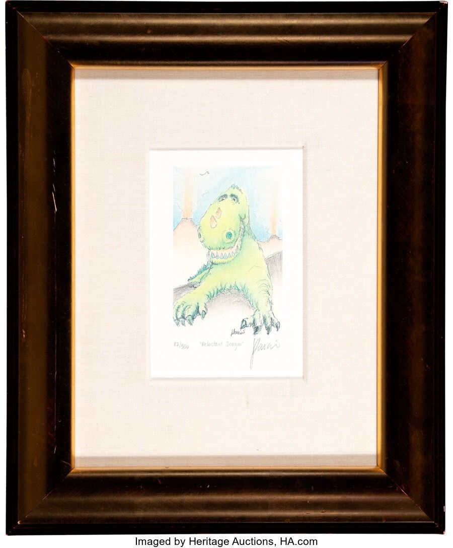 Jerry Garcia Signed "Reluctant Dragon" Limited Edition Lithograph in Frame. A limited edition lithograph of an original painting the Grateful Dead frontman made, signed by him with a pencil. Numbered "82/500." Matted and framed to an overall 19 ½" x 23 ½". Lithograph appears to be in Near Mint condition. Frame is in Very Good Plus condition with smudges, scuffing, and paint chipping. COA from Heritage Auctions.