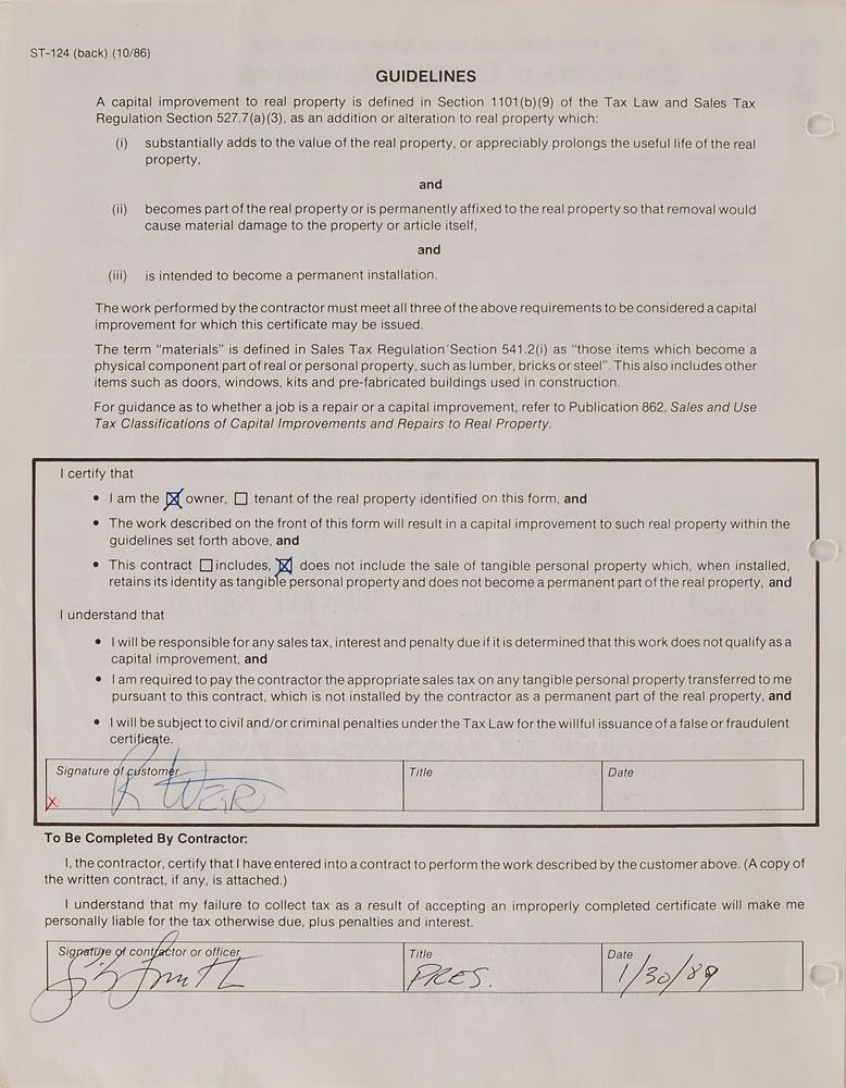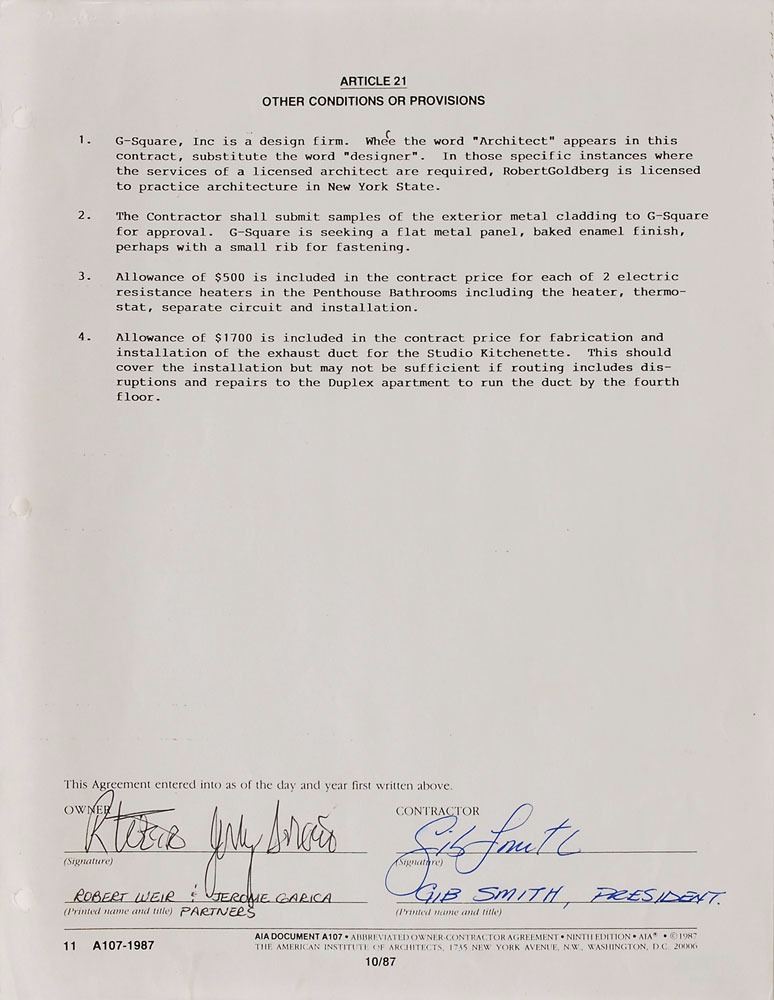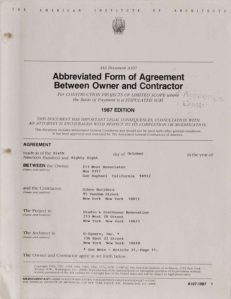 DS, signed “Jerry Garcia” and “R. Weir,” eleven pages, 8.5 x 11, October 6, 1988. An agreement outlining details for a penthouse renovation at 213 West 70th Street in New York by which Garcia and Weir hire Gibco Builders, including “demolition…Intercom, Carpet, renovation of Public Corridors except as noted.” Document is housed in a binder with numerous other papers and documents related to the project, including a New York certificate of capital improvement, January 30, 1989, signed again by Bob Weir, “R. Weir.” Two additional documents are signed by Rock Scully, a longtime manager of the band. Expected document wear and tears to binding holes to the first page, otherwise fine condition. Accompanied by a full letter of authenticity from PSA/DNA. Garcia and Weir first met on New Year's Eve 1963, befriending over a love of the Beatles and soon forming a band called Mother McCree's Uptown Jug Champions, which over time was renamed The Warlocks and, eventually, the Grateful Dead. An intriguing East Coast document that presents opportunity for further Dead research.